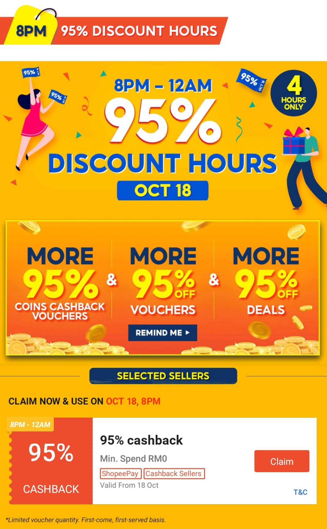 i)当天8pm 开始可享有95%现金回扣券、95%折扣券,以及95%折扣商品!!