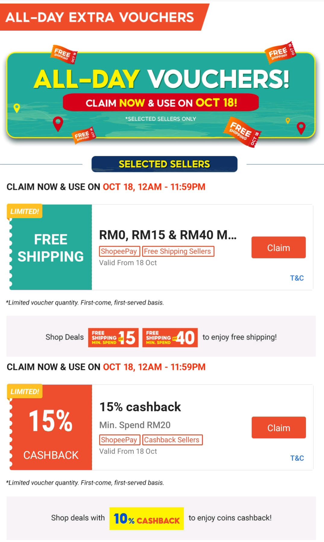 i)你还可领取全天候的免邮券 + 15%Shopee 币回扣券!