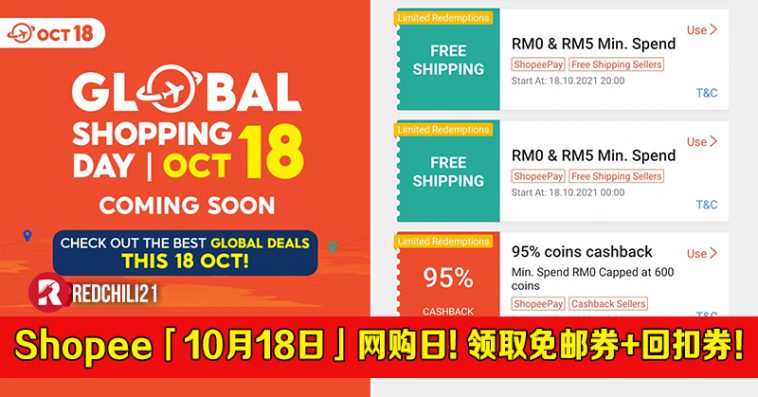 Shopee 将在10月18日举办【Global Shopping Day】全球购物促销日!Shopee 用户可在10月18日当天享有最低RM0 免邮券、95%现金回扣券,以及享有最低RM0.18 促销商品!
