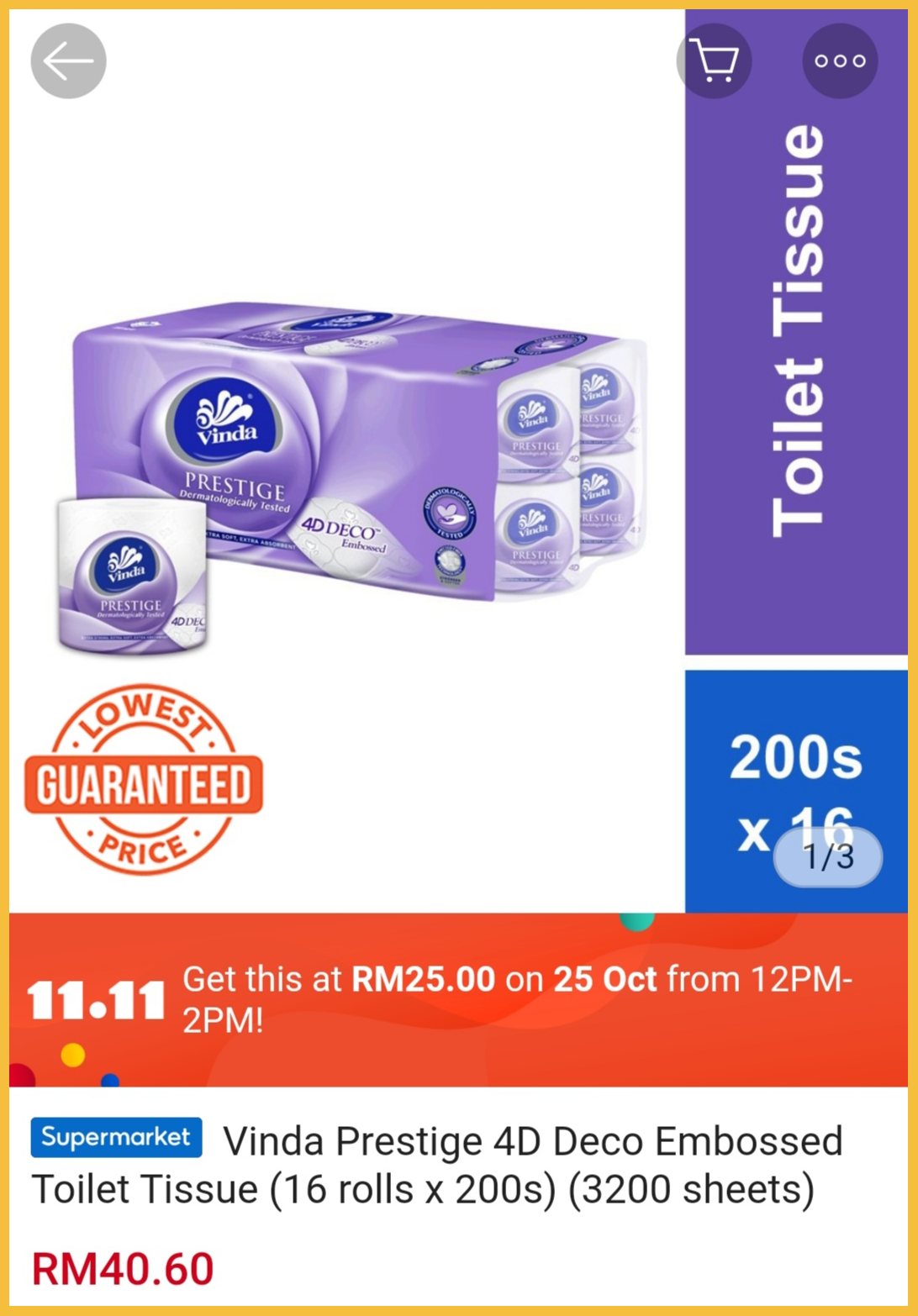 ▪ Vinda Prestige 4D Deco Embossed Toilet Tissue (16 rolls x 200s) – RM40.60 RM25