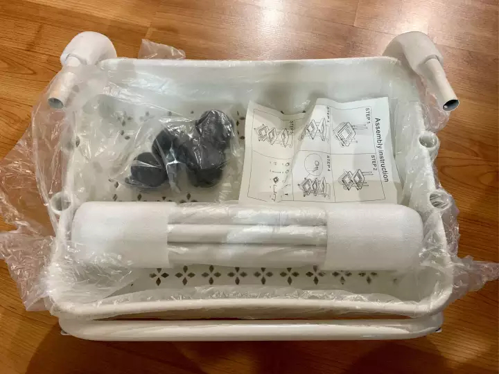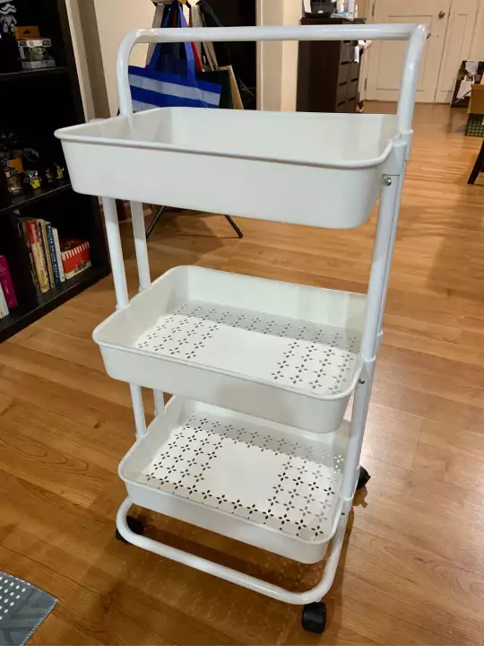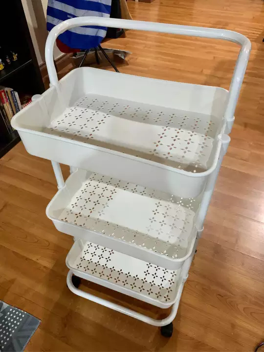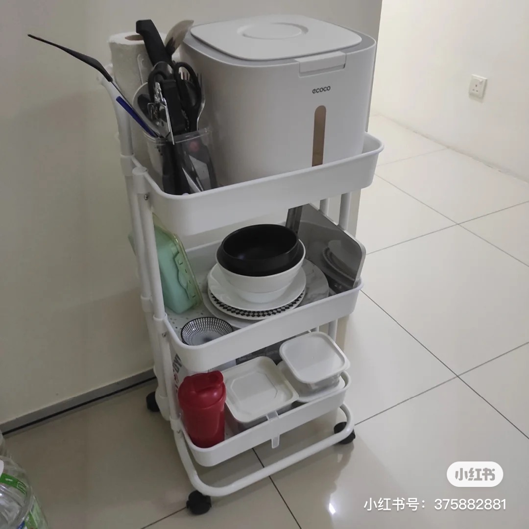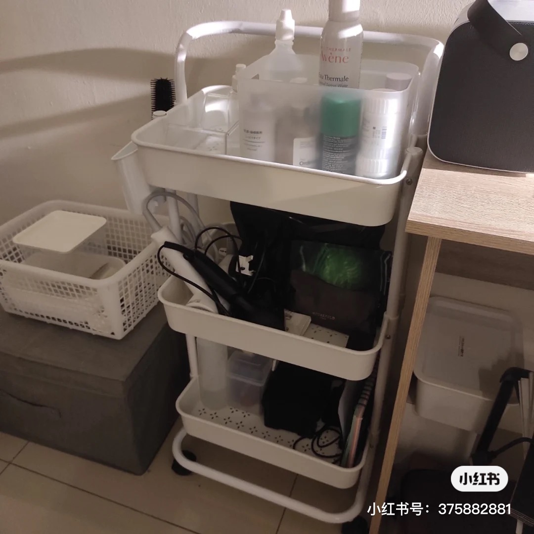 大概是半年前买的,铁制的太贵了,所以买了个塑料的来代替。收到时有点脏脏的,要自己抹干净。而且它的轮子不好推,带着它搬家推到半si。