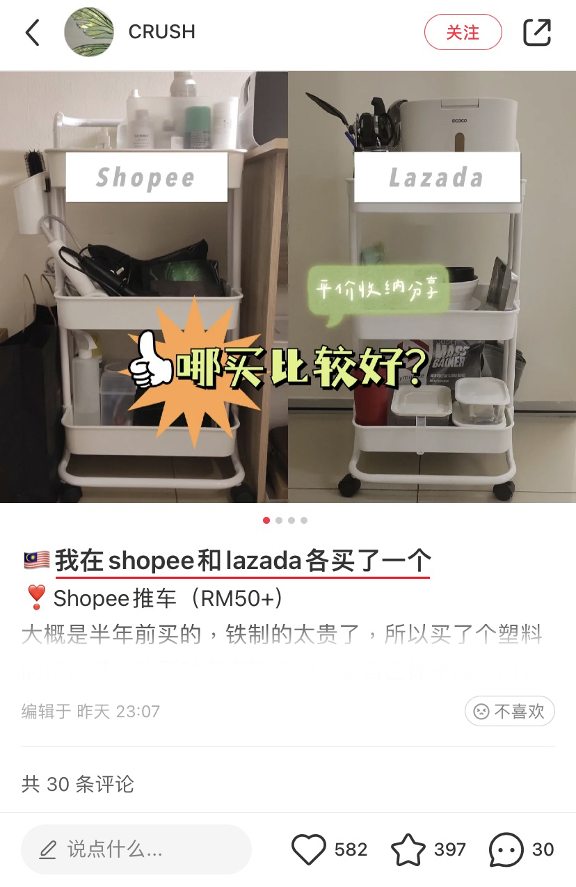 昨天一名大马博主在小红书分享自己的网购经历,同款小推车分别在 Shopee 和 Lazada 都入手了一个但价钱却差很多,而且质量也不太一样?!