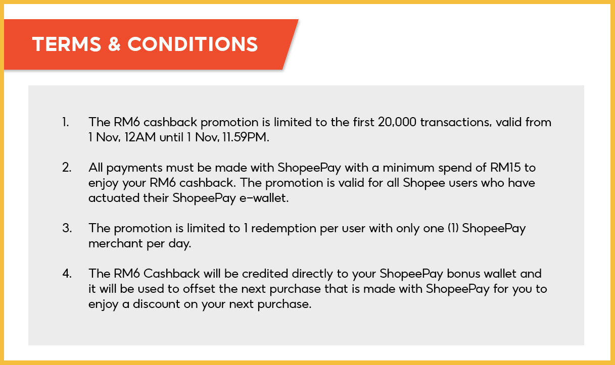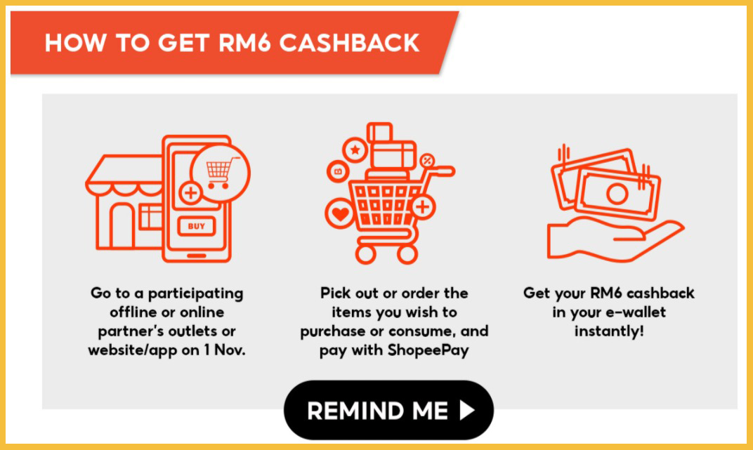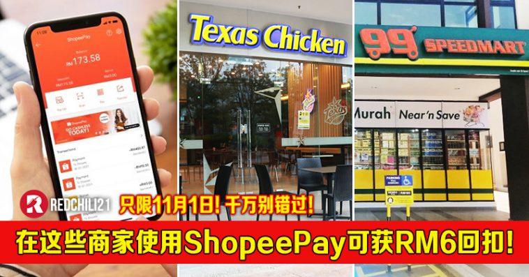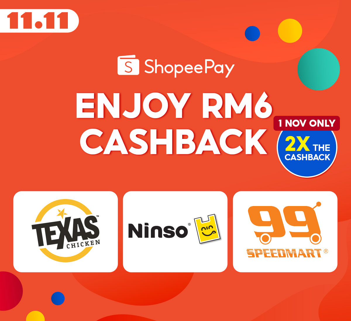 只要你在11月1日当天,到指定的超市及商店消费RM15 就可获得RM6 现金回扣!必须使用ShopeePay 电子钱包付款才能享有回扣!