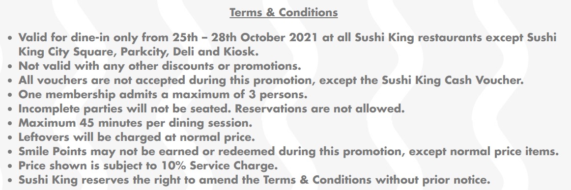 - 在优惠不接受任何折扣券,除了Sushi King Cash Voucher