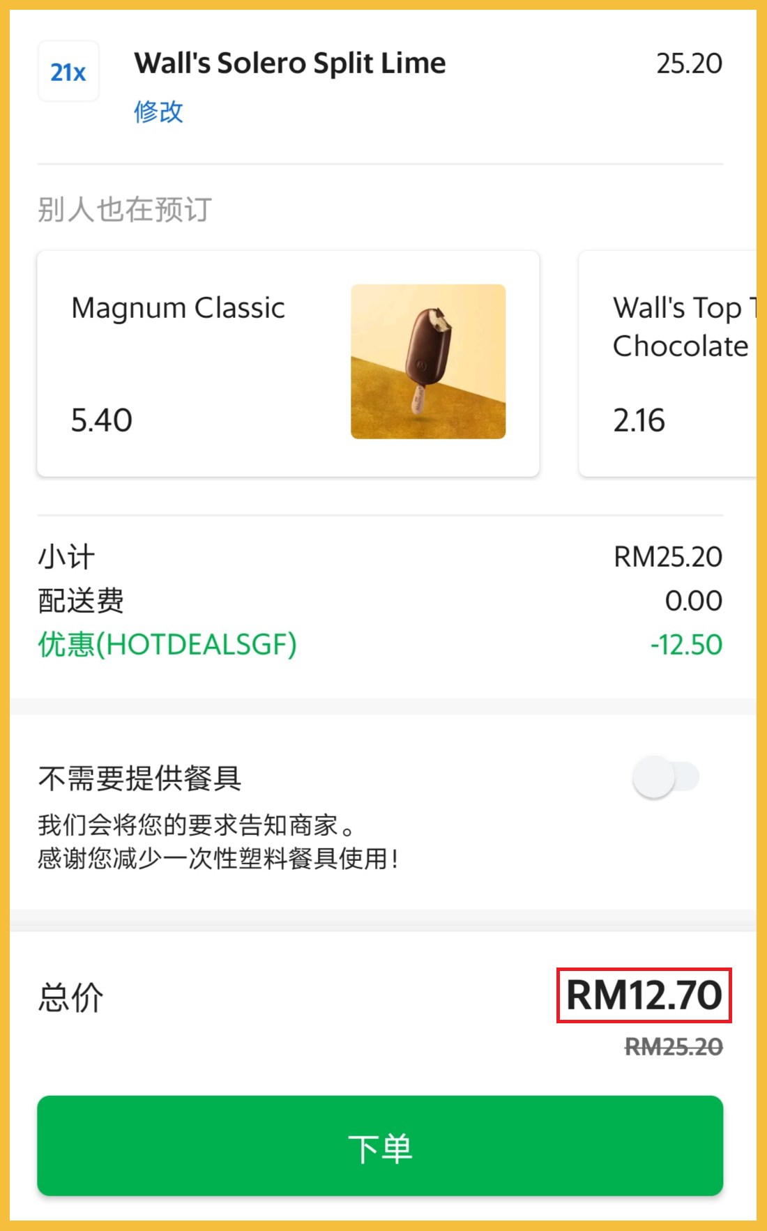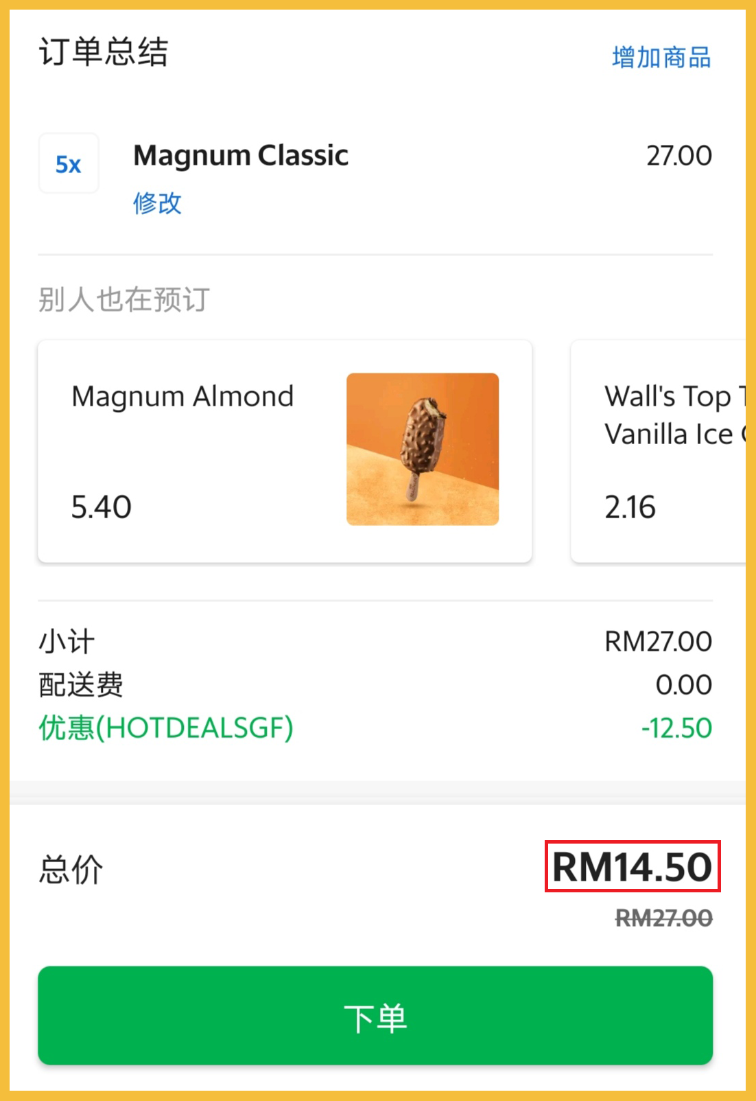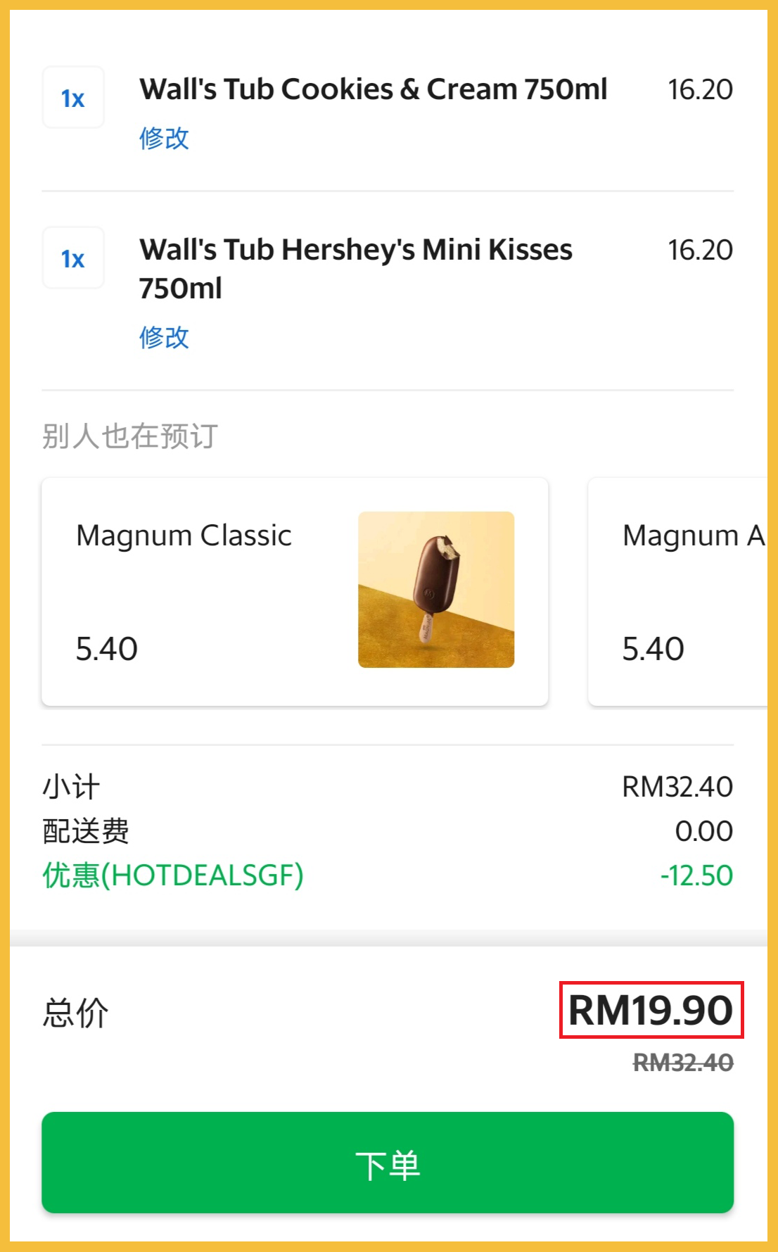促销活动:使用GrabFood 购买Wall’s 雪糕,可获得【HOTDEALSGF】50%折扣