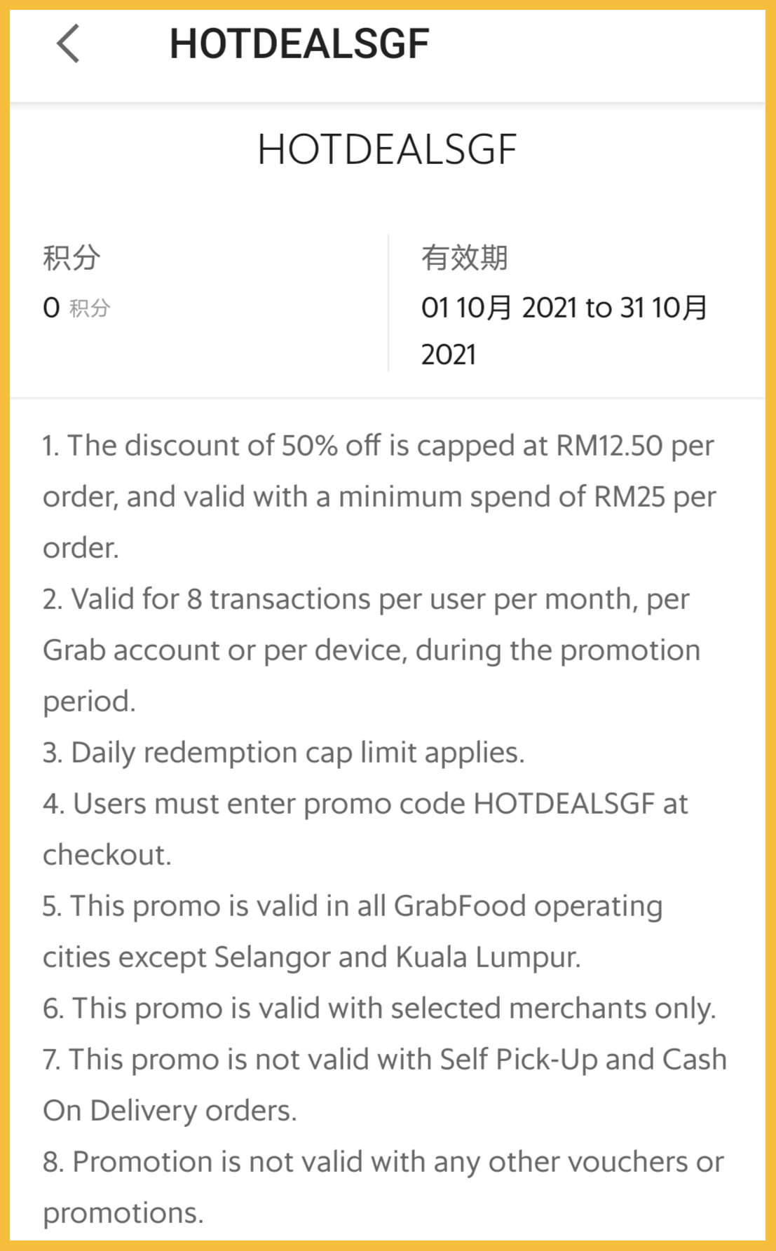 - 必须通过GrabFood 订购食物(限定指定餐厅)