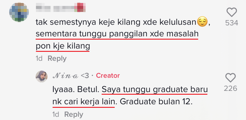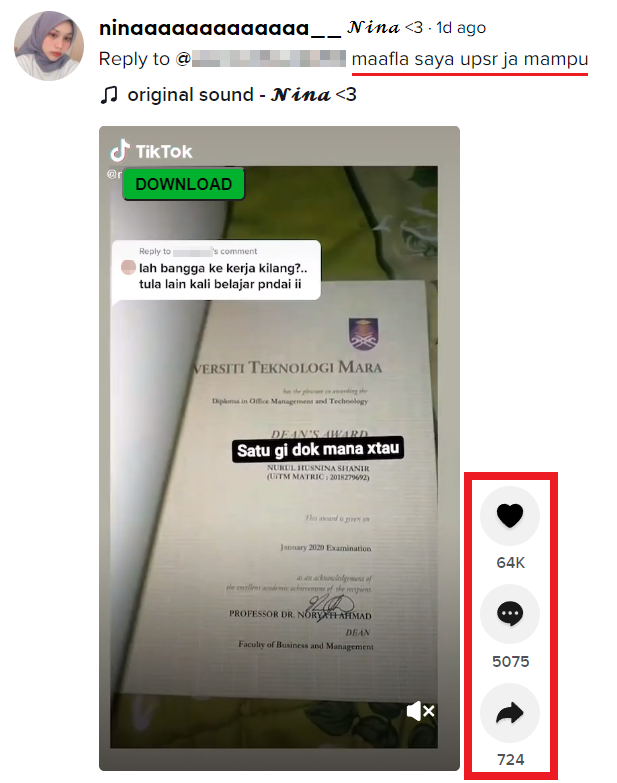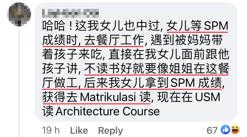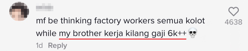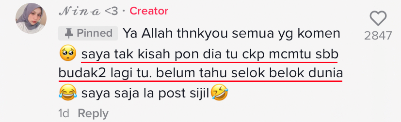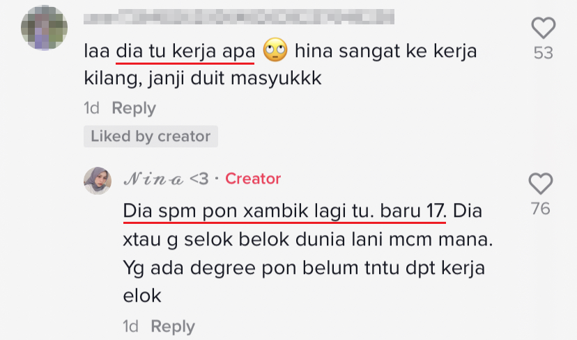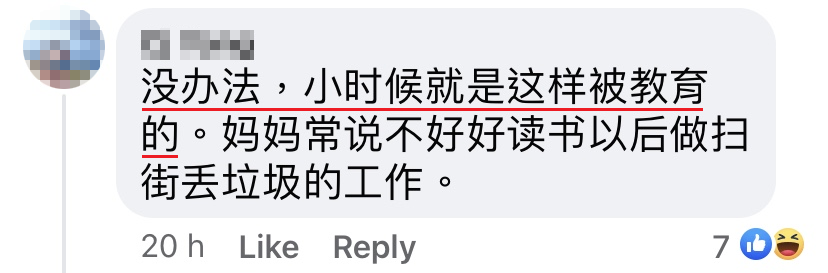 名为“Nina”的工厂职员日前在 Tiktok 看到一条恶意评论,一名网民刻意在她的其中一则帖文留言:「在工厂做工很自豪吗?以后要好好读书知道吗?!」Nina看到以后就以分享视频的方式回应写道:「不好意思啦,我只有UPSR的资格!」