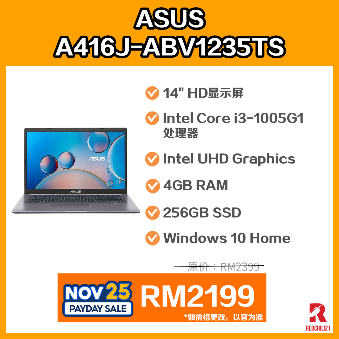 ▪ ① Asus ( A416J-ABV1235TS / A416J-ABV050TS / A416J-ABV051TS ) 14″ Laptop I3-1005G1 4GD4 256GB Win10H