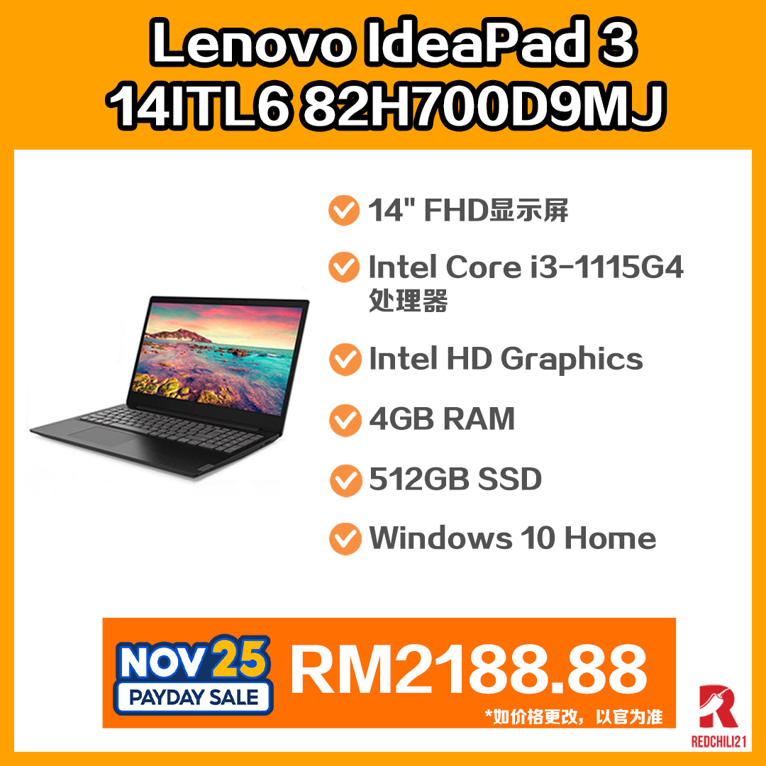 ▪ ⑩ Lenovo IdeaPad 3 14ITL6 82H700D9MJ 14” FHD Laptop Sand ( i3-1115G4, 4GB, 512GB SSD, Intel, W10, HS )