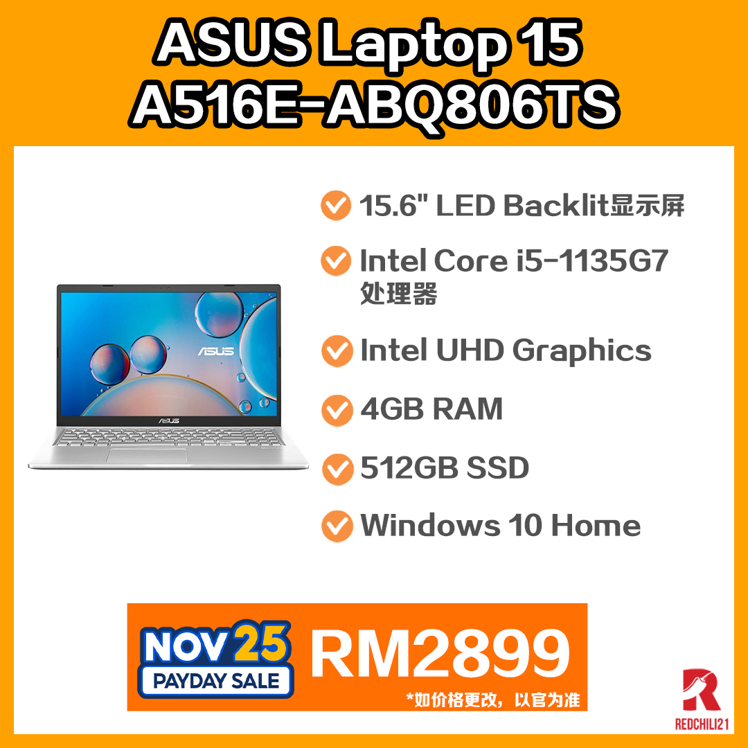 ▪ ② ASUS Laptop 15 (A516E-ABQ806TS) i5-1135G7 / 4GB RAM / 512GB SSD / 15.6” FHD/ MS OFFICE / 2 YEARS WARRANTY