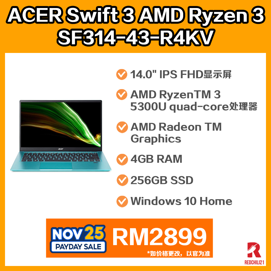 ▪ ③ Acer Swift 3 AMD Ryzen 3 Laptop – SF314-43-R4KV/SF314-43-R67H (Electric Blue/Pure Silver)