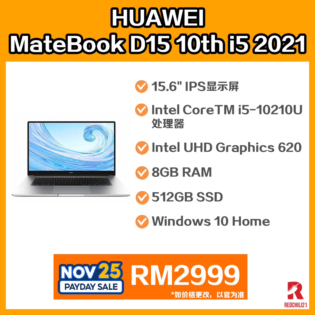 ▪ ⑤ HUAWEI MateBook D15 10th i5 2021 Laptop (8GB + 512GB) | Free Backpack
