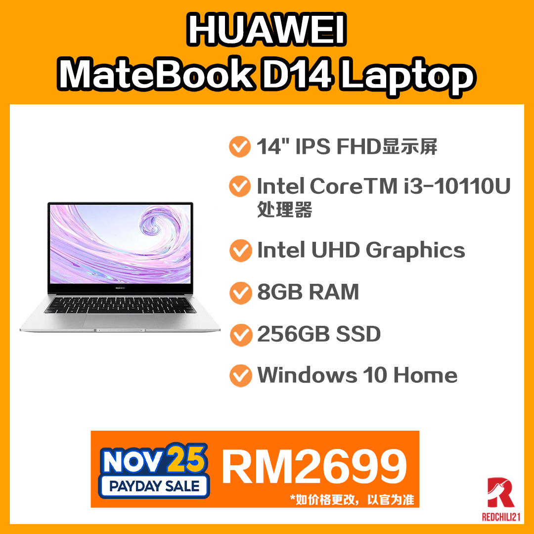 ▪ ⑥ HUAWEI MateBook D14 Laptop | 8GB+256GB | Intel CoreTM i3-10110U Processor | FREE Backpack | LTD