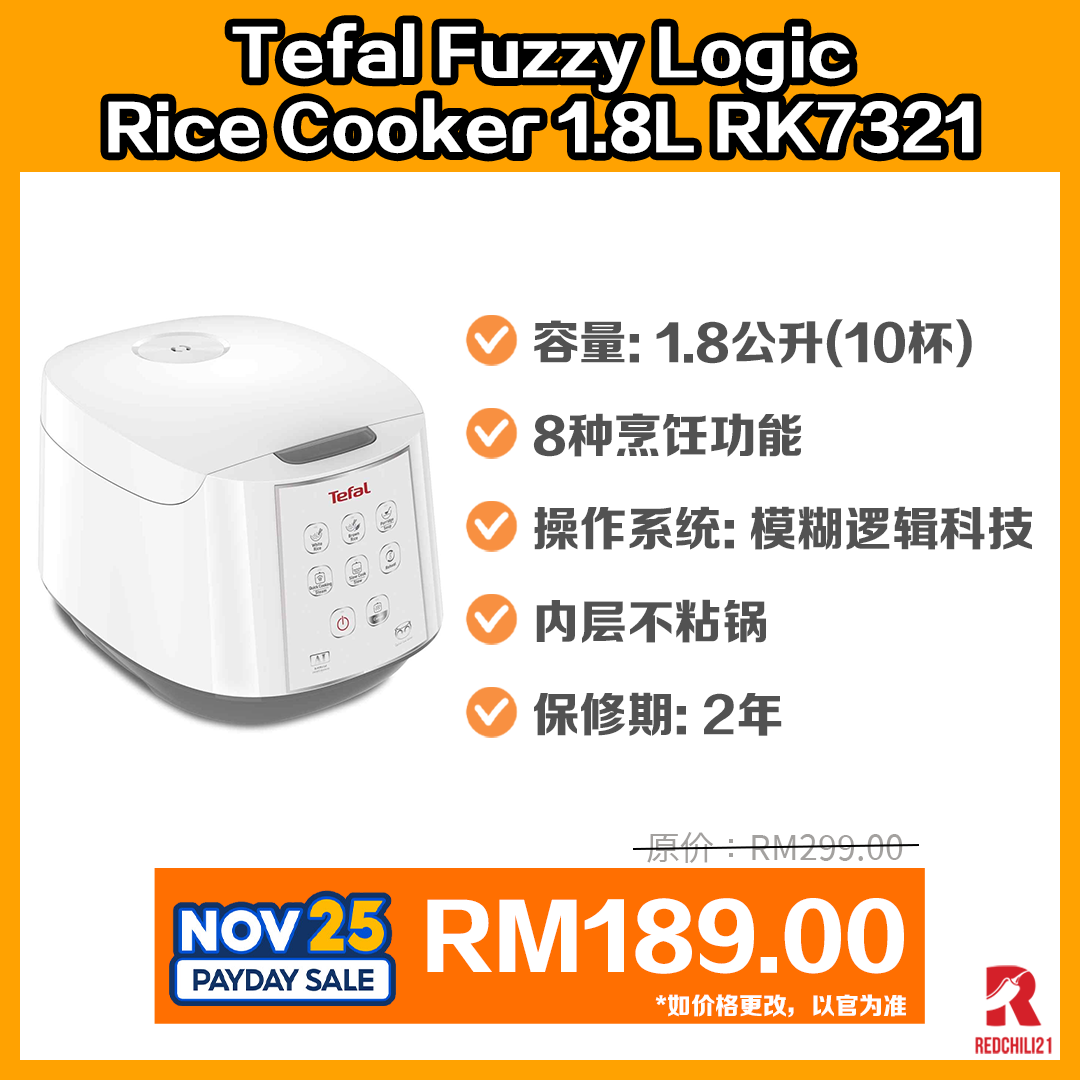 ▼ Tefal Fuzzy Logic Rice cooker (1.8L/10 Cups) RK7321 – RM299.00 RM189.00(11月25日促销 12am-2am)
