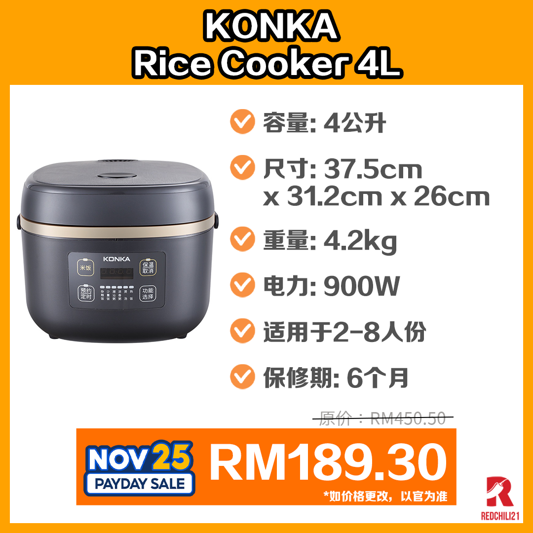 ▼ KONKA Rice Cooker 4L With Non-Stick Pan/Rice Scoop – RM450.50 RM189.30