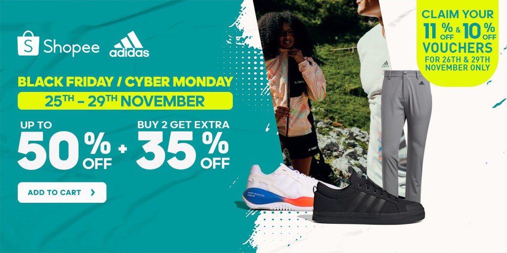 促销活动:Shopee Adidas 官网【Black Friday /Cyber Monday】大促销,折扣高达50%!买2样额外折扣35%!