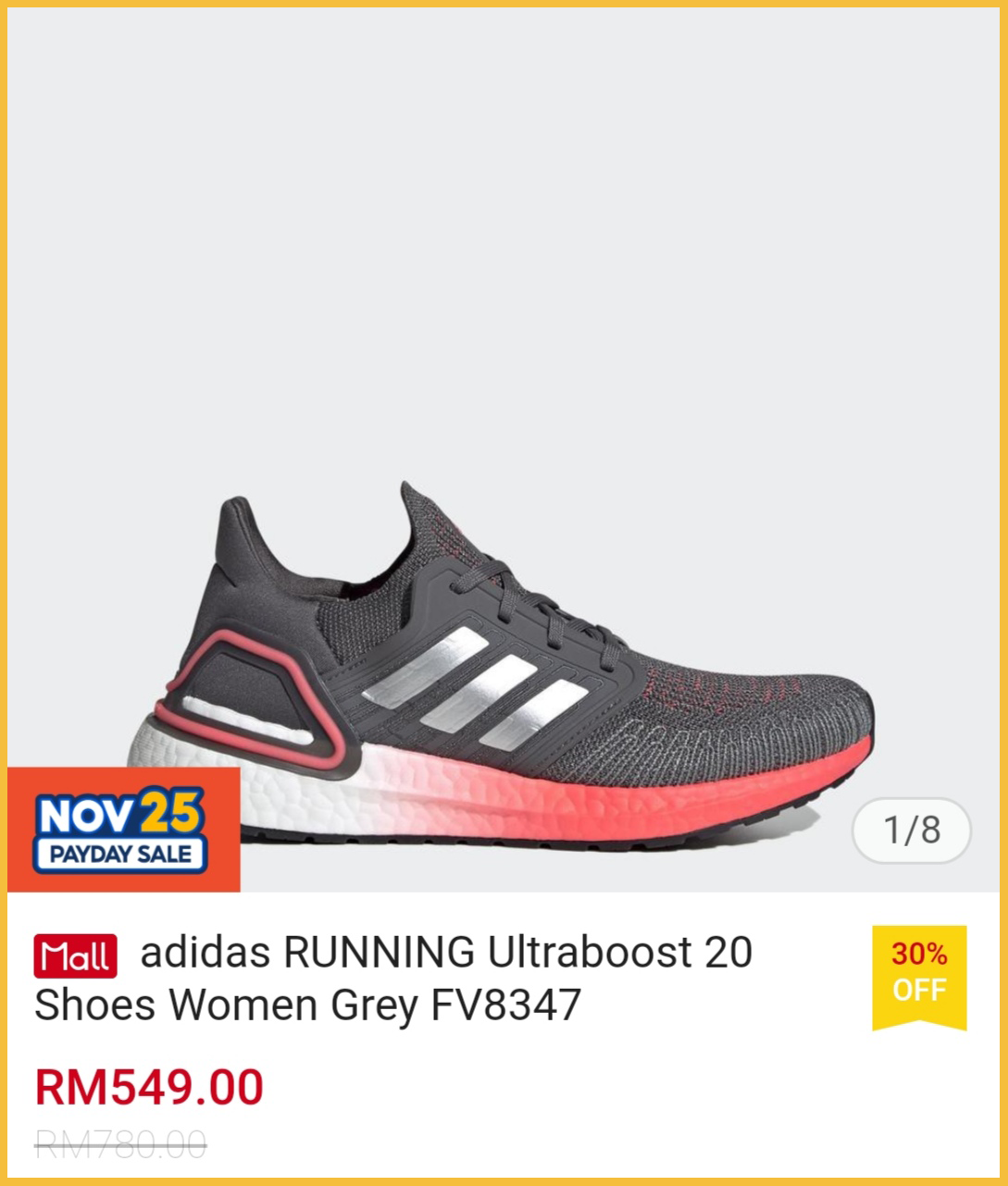 adidas RUNNING Ultraboost 20 Shoes Women Grey FV8347【折扣30%】- RM549(原价RM780)