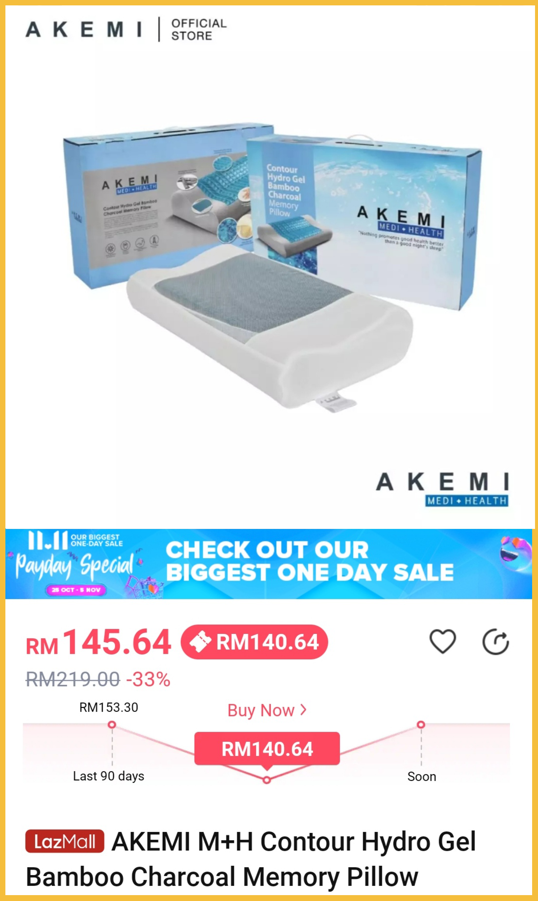 ▼③ AKEMI M+H Contour Hydro Gel Bamboo Charcoal Memory Pillow – RM219 RM140.64