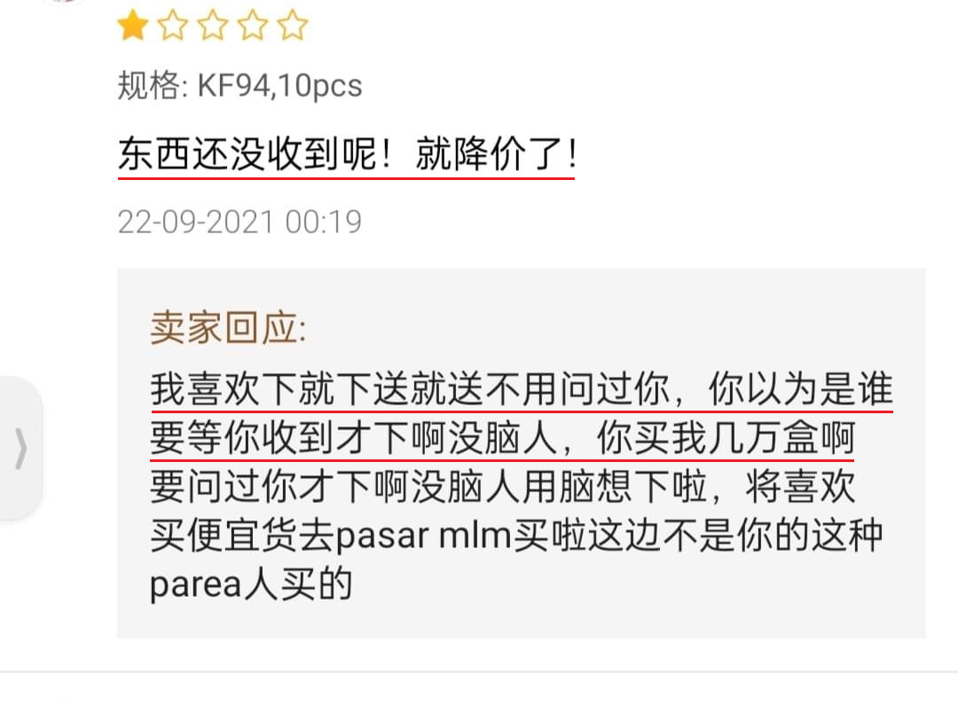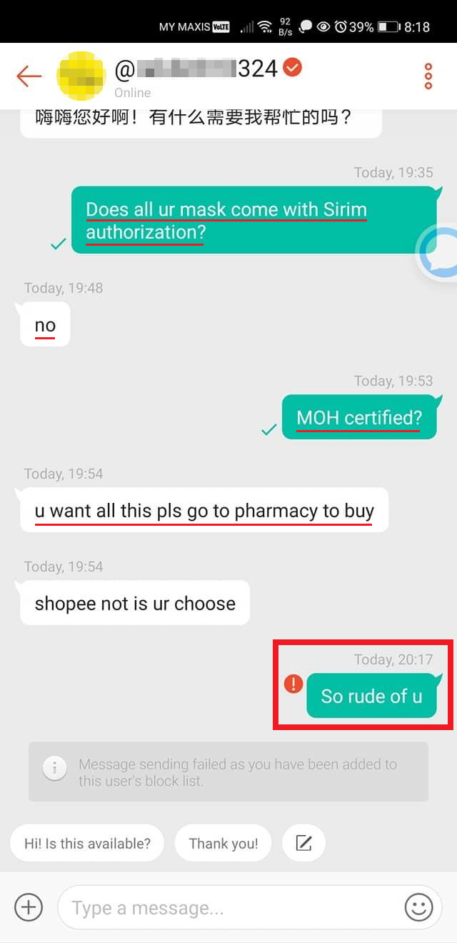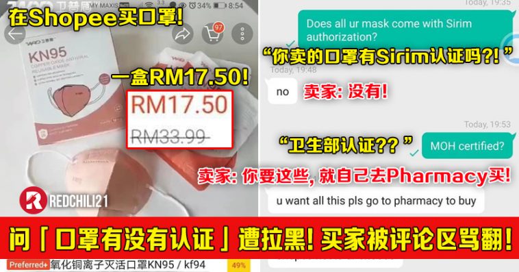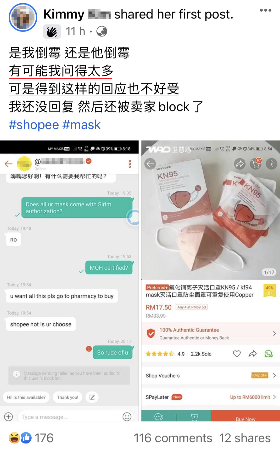 网购KN95口罩询问卖家是否有认证结果被拉黑,大马买家PO文表示不解:究竟是我倒霉还是他倒霉?
