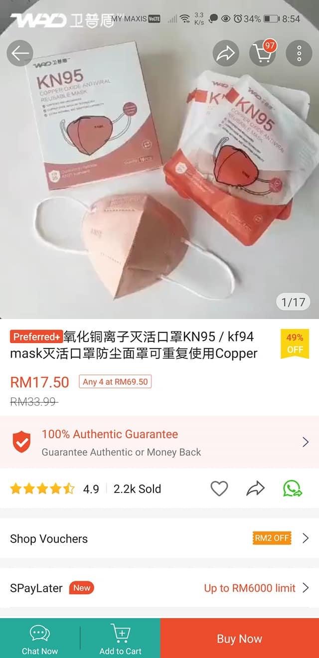 ▼ 帖主在 Shopee 看到一家店铺售卖 KN95 口罩,品名写着“氧化铜离子灭活口罩”还特别注明“可重复使用”,一盒10片装,售价RM17.50,评价有高达4.9颗星。