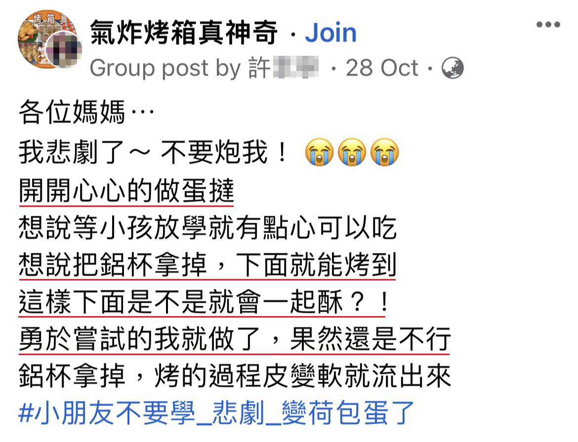 自己动手制造蛋挞其实并不难,细节和步骤也不多,但如果在过程中做错了一步,可能就会像这位台湾妈咪一样,把蛋挞做成一场悲剧了…
