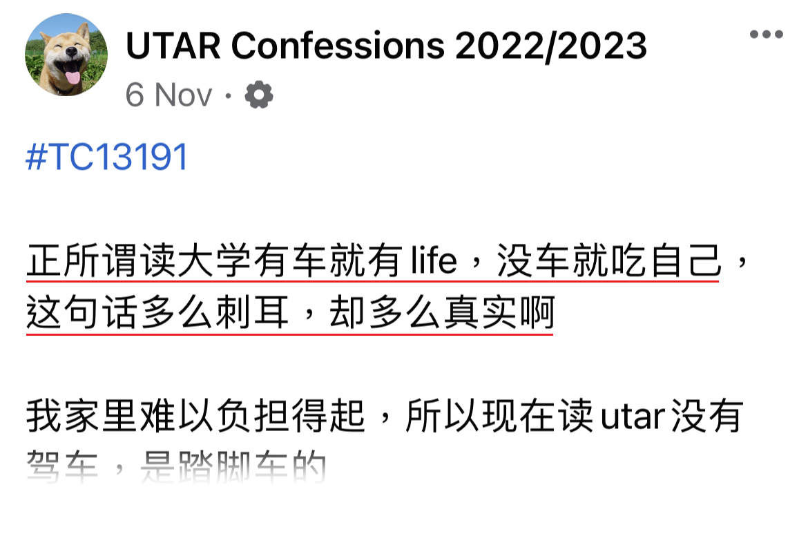 大马一名大学生日前在 “UTAR Confessions” 投稿PO文,因为家境不好所以每天骑自行车代步,然而身边的同学们都有自己的车,这导致他无法融入朋友圈并感慨地表示:读大学有车才有life,这句话多么刺耳又真实!