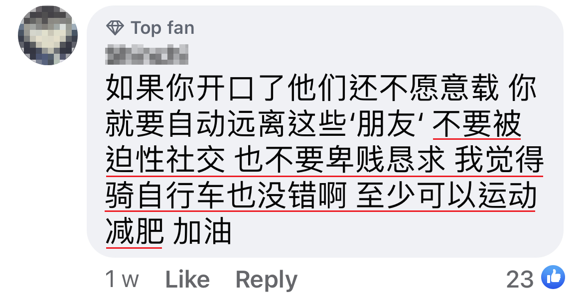 他们又不愿意载我,那些男同学如果女的叫他们载,他们就ok,我的话就百万个不愿意。我不想那么没有尊严求他们载,所以索性每次都不和他们一起吃东西、出去玩。