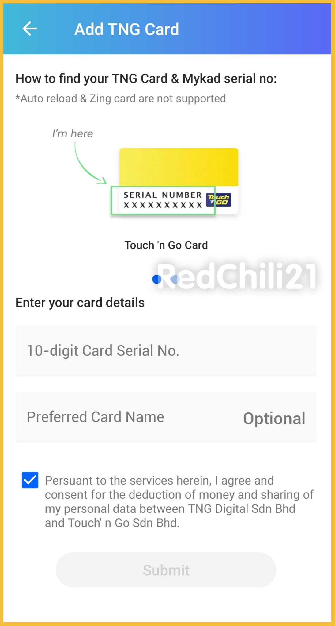 步骤4:倘若你是添加TNG Card 仅需输入TNG 卡10个号码,后为此卡取名。