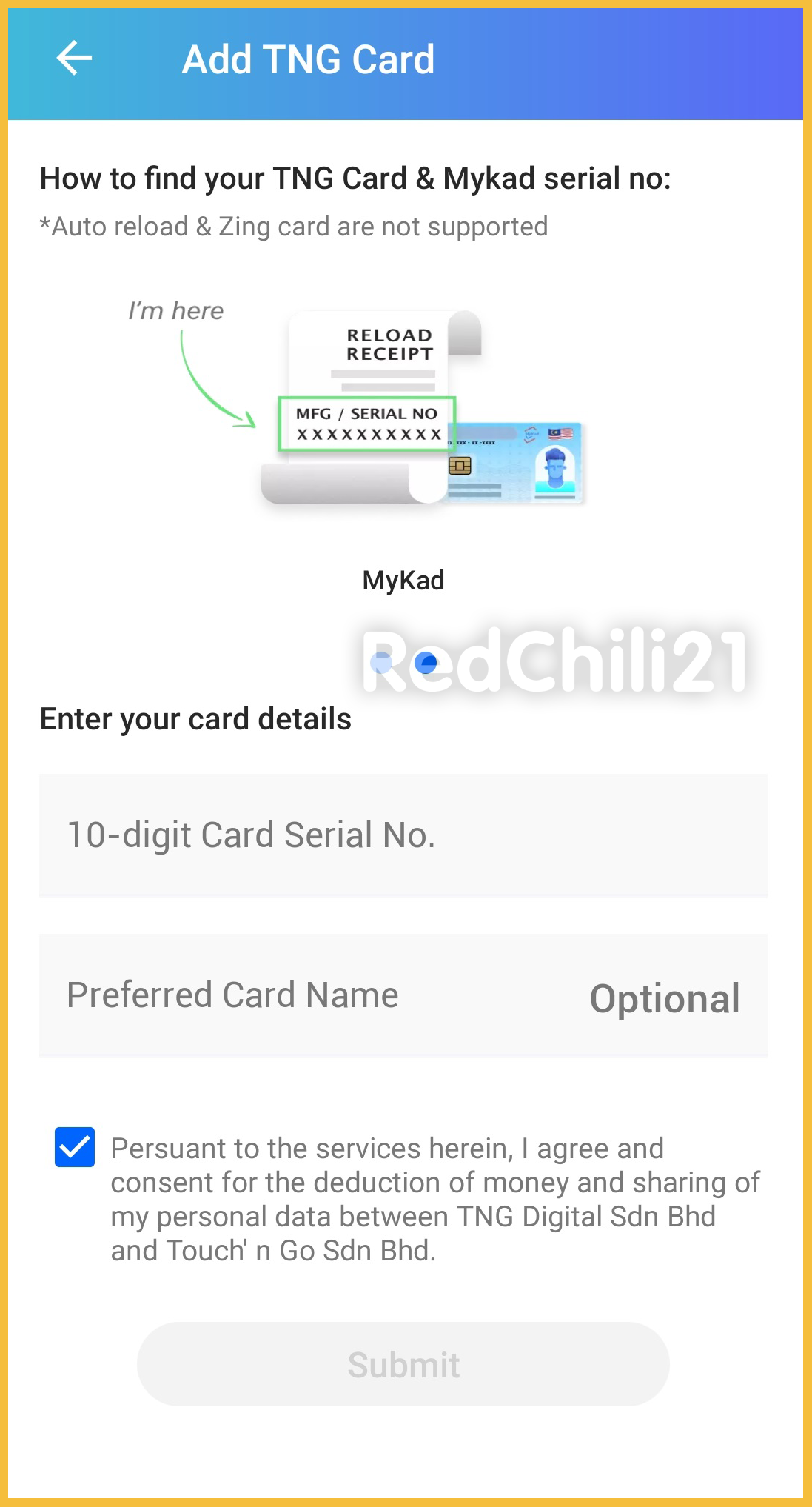 ※ 如果你是添加MyKad,需先充值后并在收据上获取MyKad 里的TNG 10个号码。