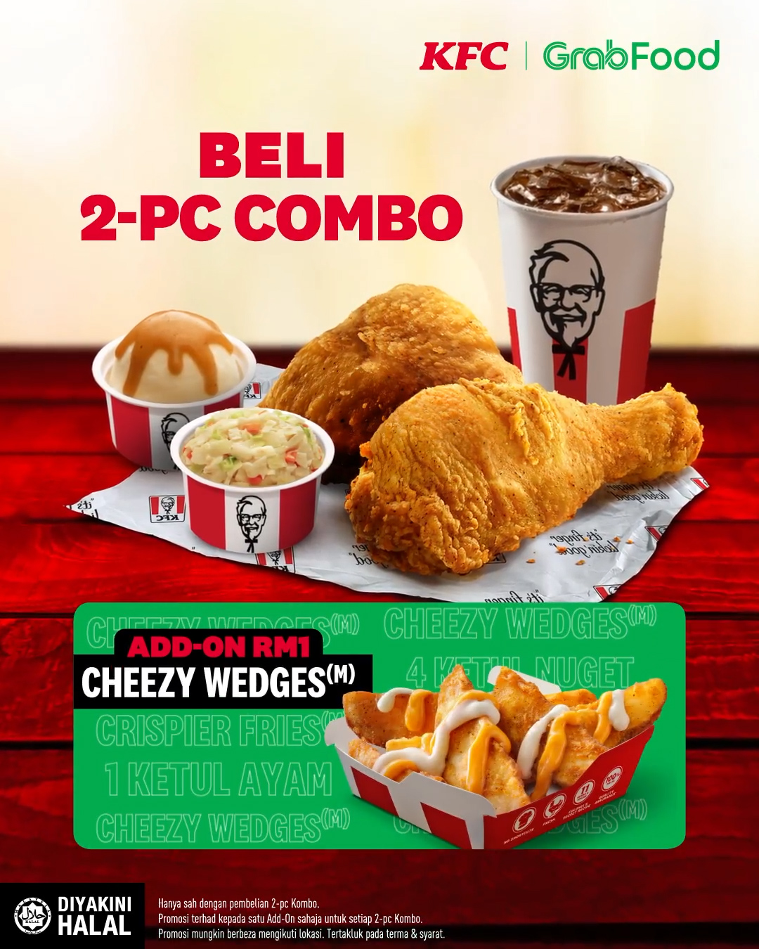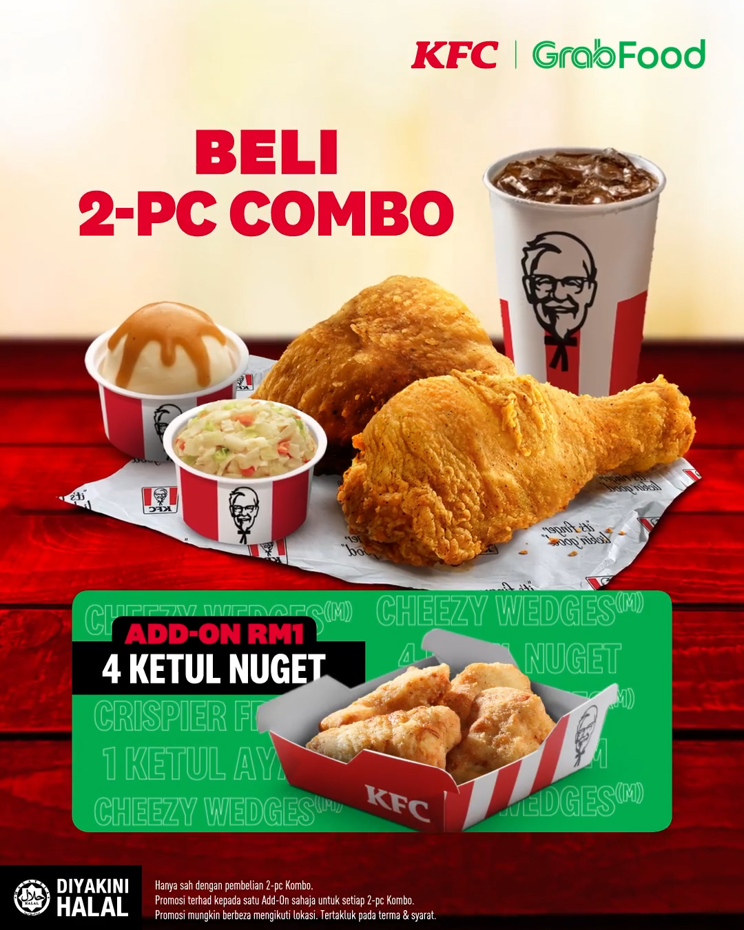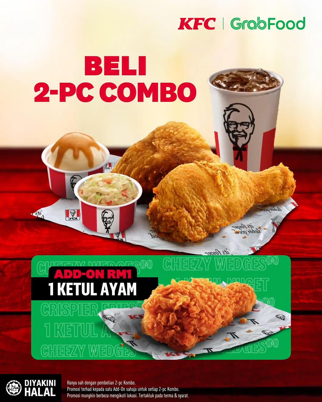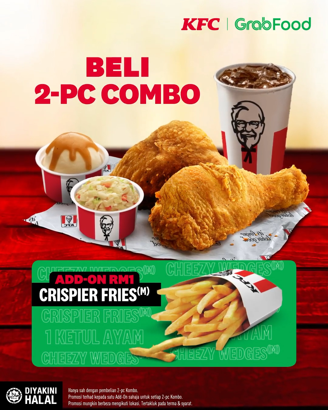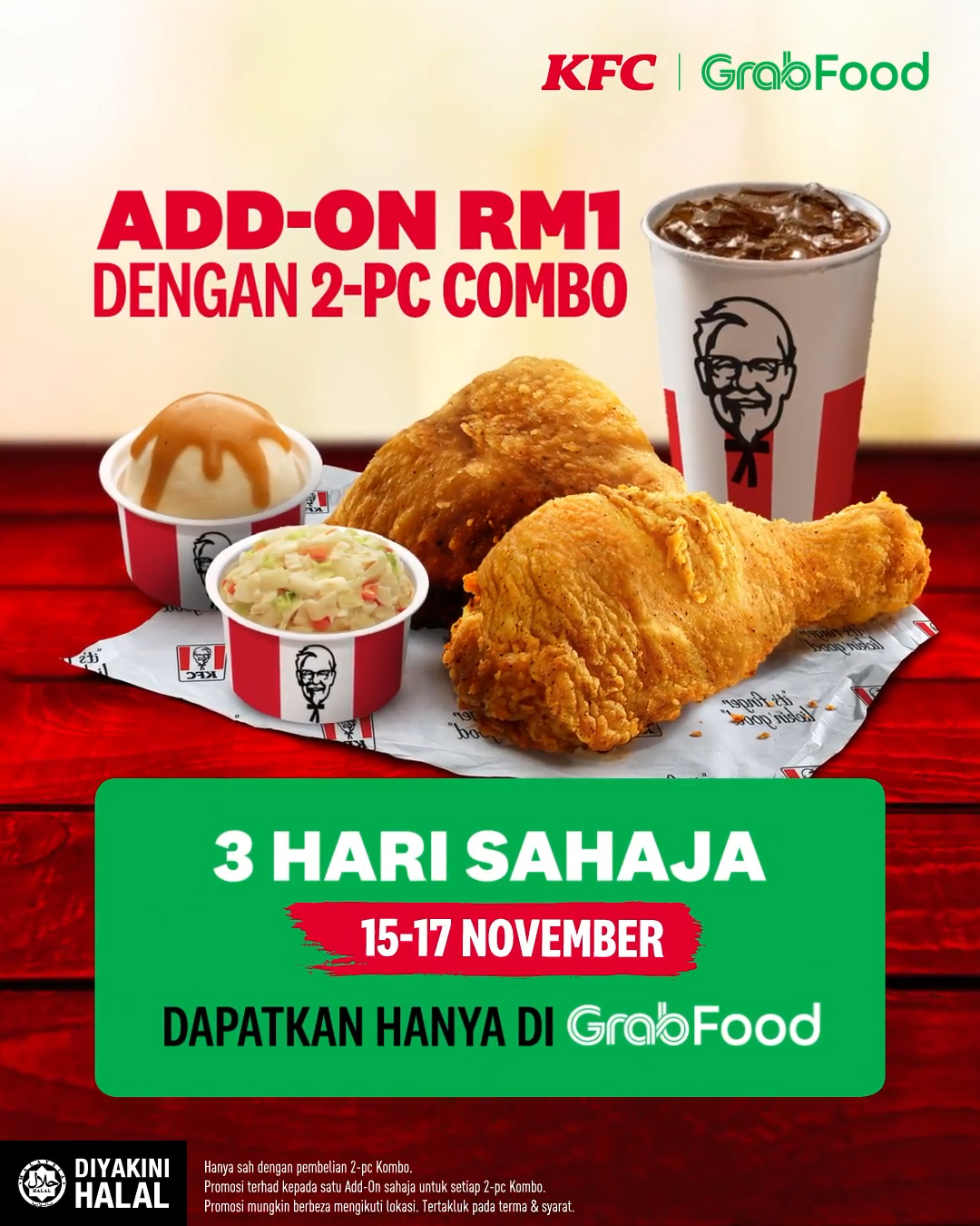 这项优惠是由KFC 与GrabFood 从11月15日至11月17日联合推出的超值优惠!只要你购买一份2块炸鸡套餐,就可享有RM1 优惠价格添购小吃!
