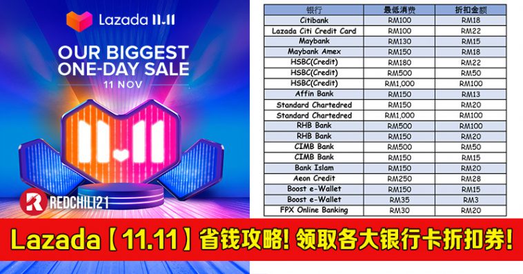 为了配合双11购物节的到来,大马Lazada 将在这个月份推出【11.11】大促销,并送出高达RM100 银行卡优惠券给大家!