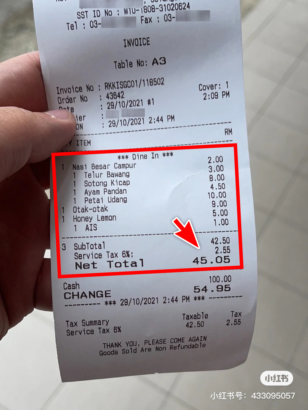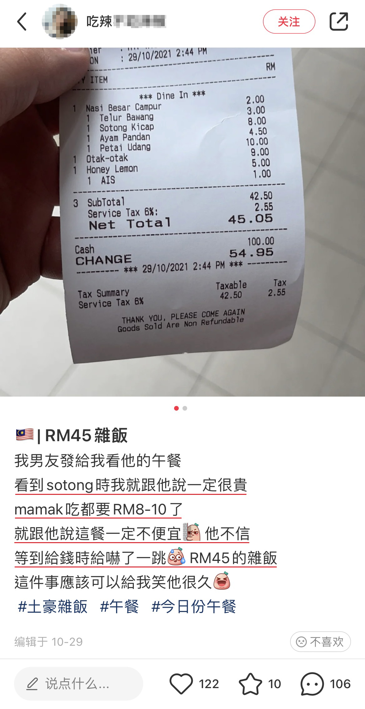 一名大马女子日前在小红书分享男友在一家著名 Mamak 店堂食的经历,一盘“杂饭”加一杯简单饮料,这一餐居然花了RM45!