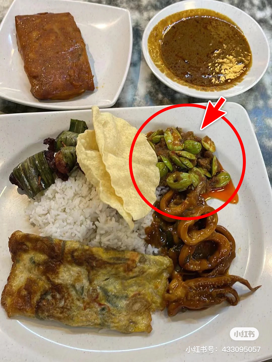 男事主当天点了一盘大的“杂饭”(Nasi Besar Campur),然后拿了好几样菜,其中包括洋葱炒蛋(RM3)、酱油炒墨鱼(RM8)、班兰鸡肉(RM4.50)、虾仁臭豆(RM10)以及Otak-otak(RM9),加上一杯RM6的冰蜂蜜柠檬,总价是RM45.05!