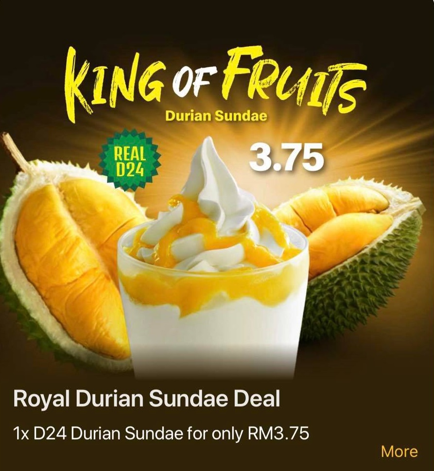 ▼ 另外,在McD App 中还推出D24 Durian Sundae 优惠,一支只需RM3.75!
