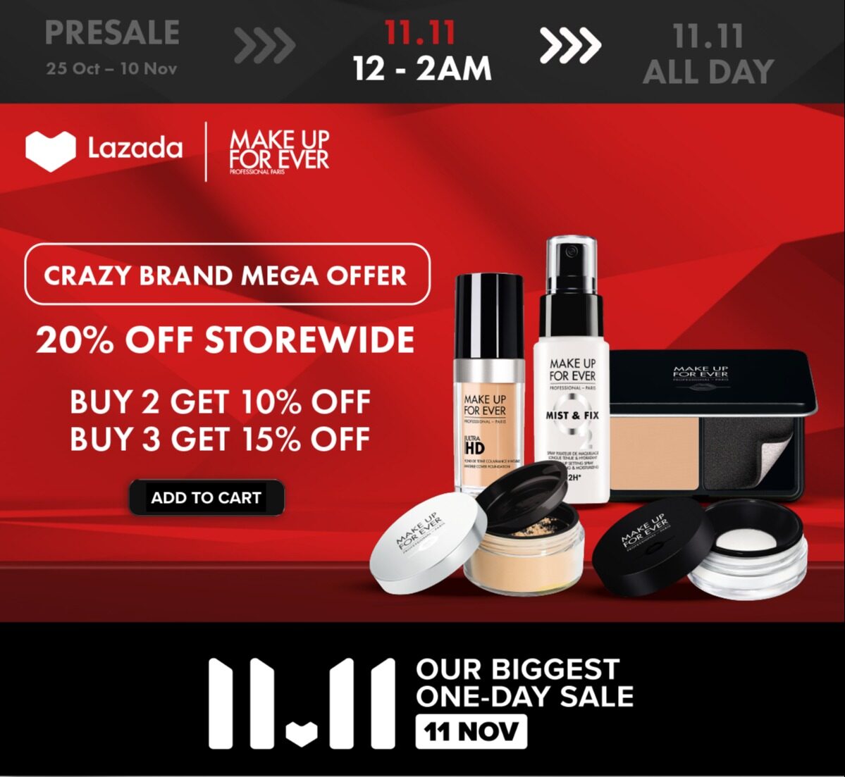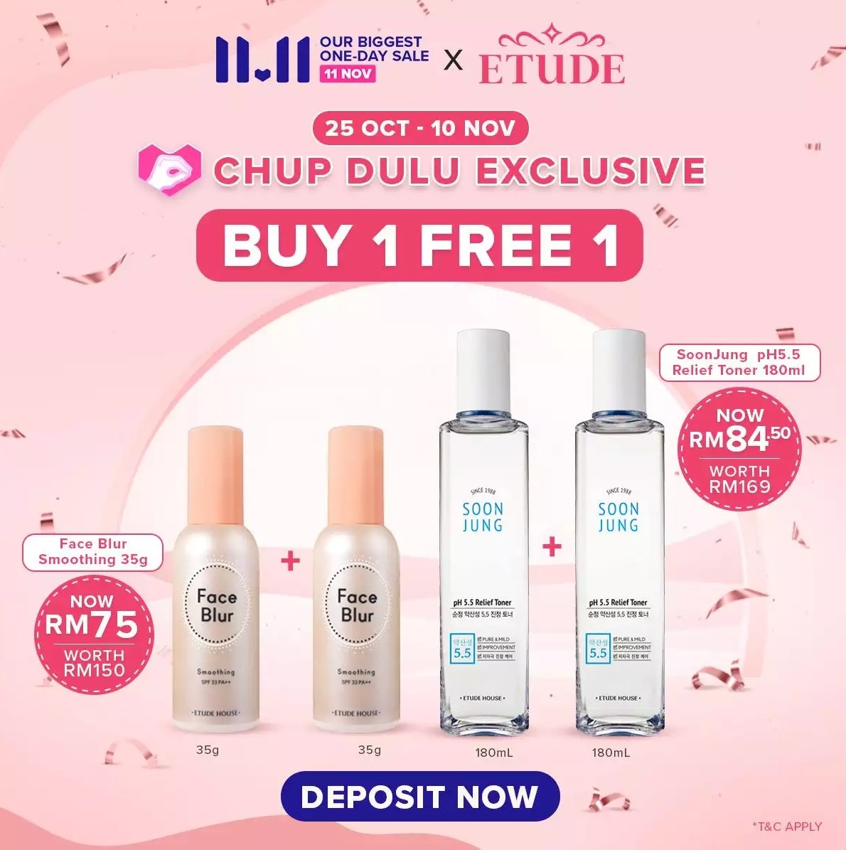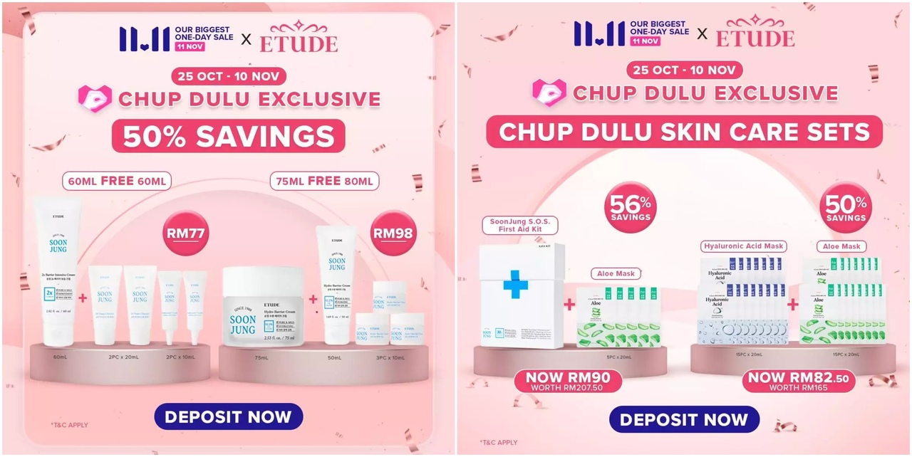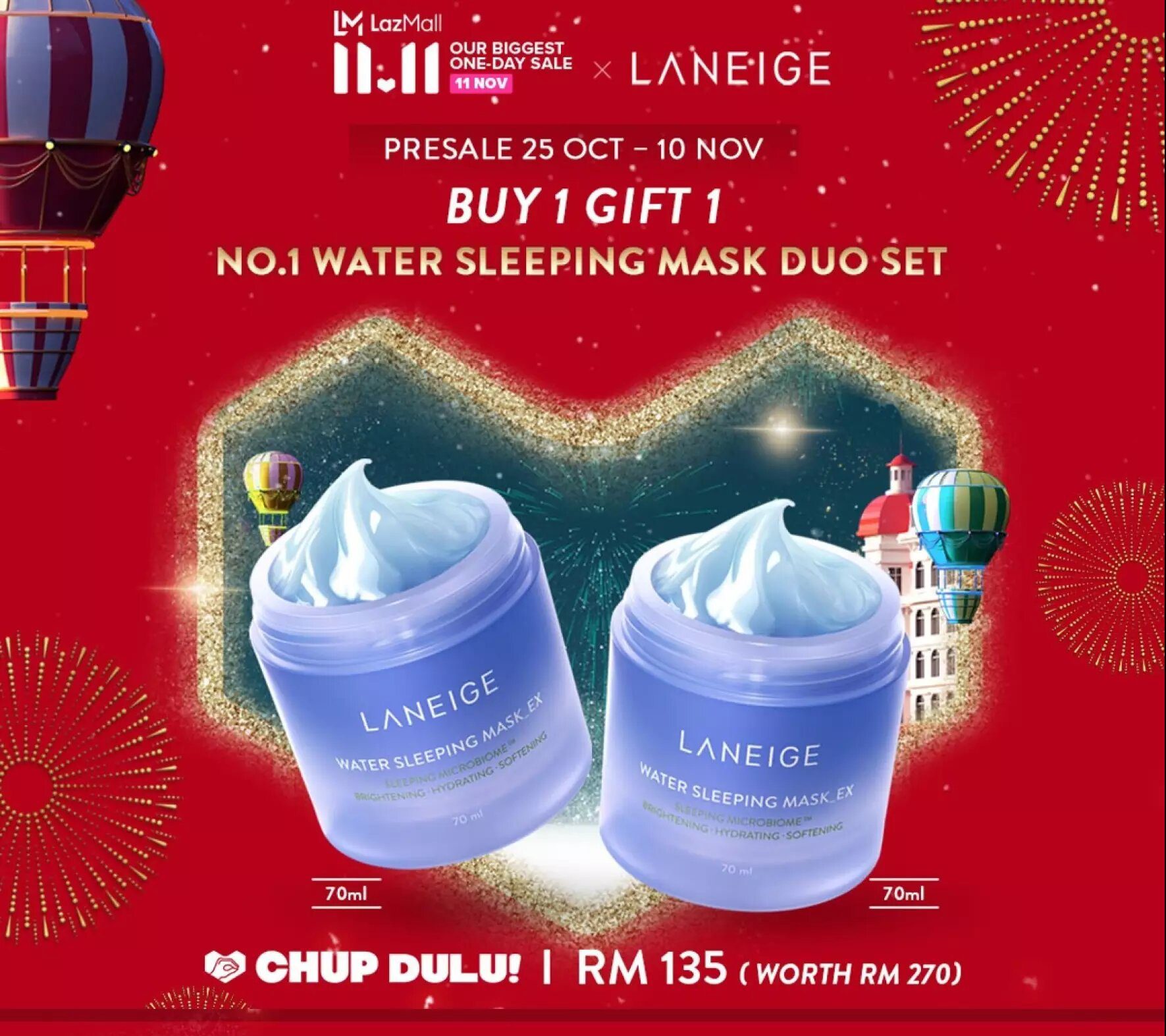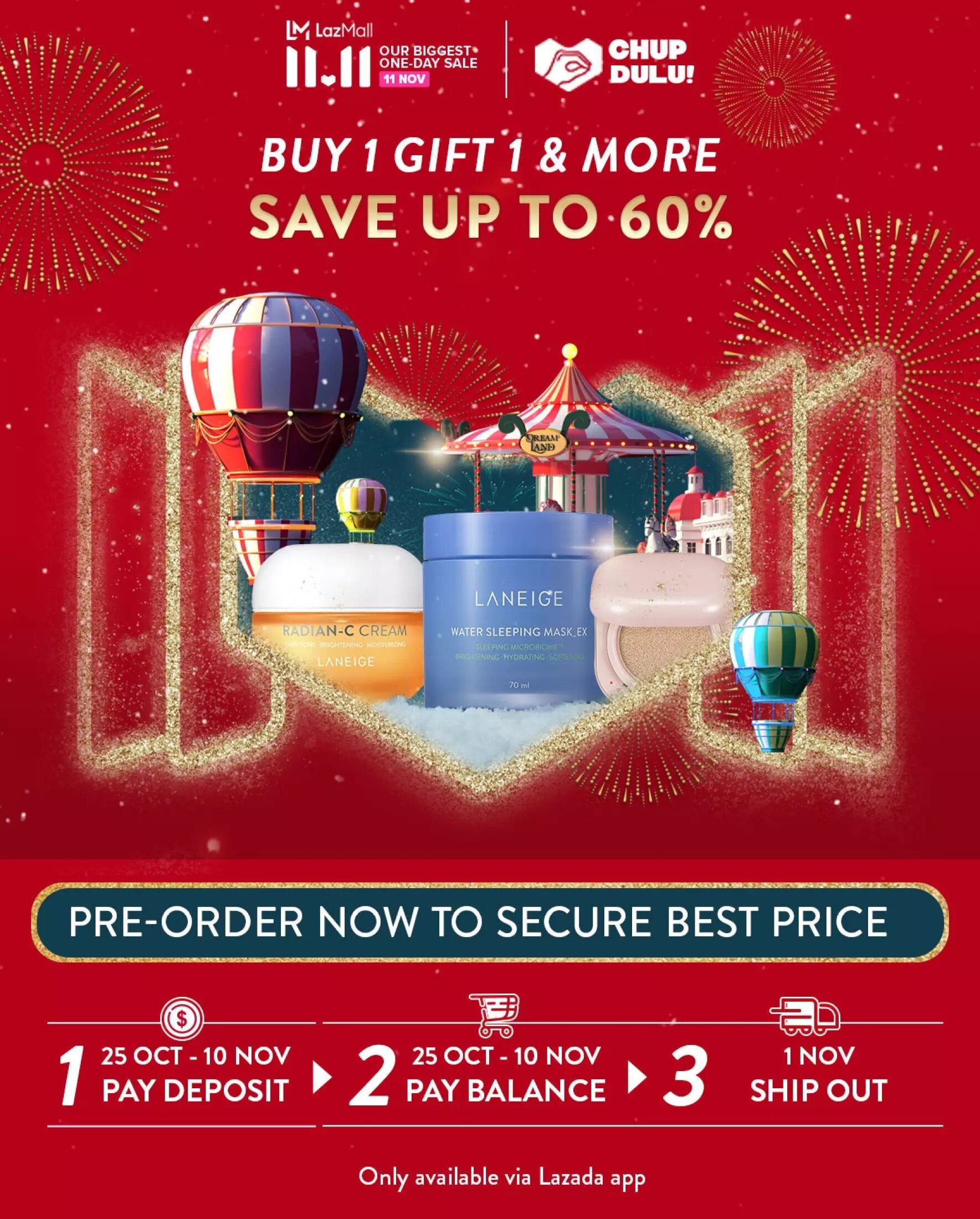 大马网购平台Lazada 与众多护肤品旗舰店纷纷推出【11.11 Chup Dulu】优先预购优惠!只要你在即日起至11月10日期间,预购美妆护肤品,可享有高达70%折扣及买一送一优惠!