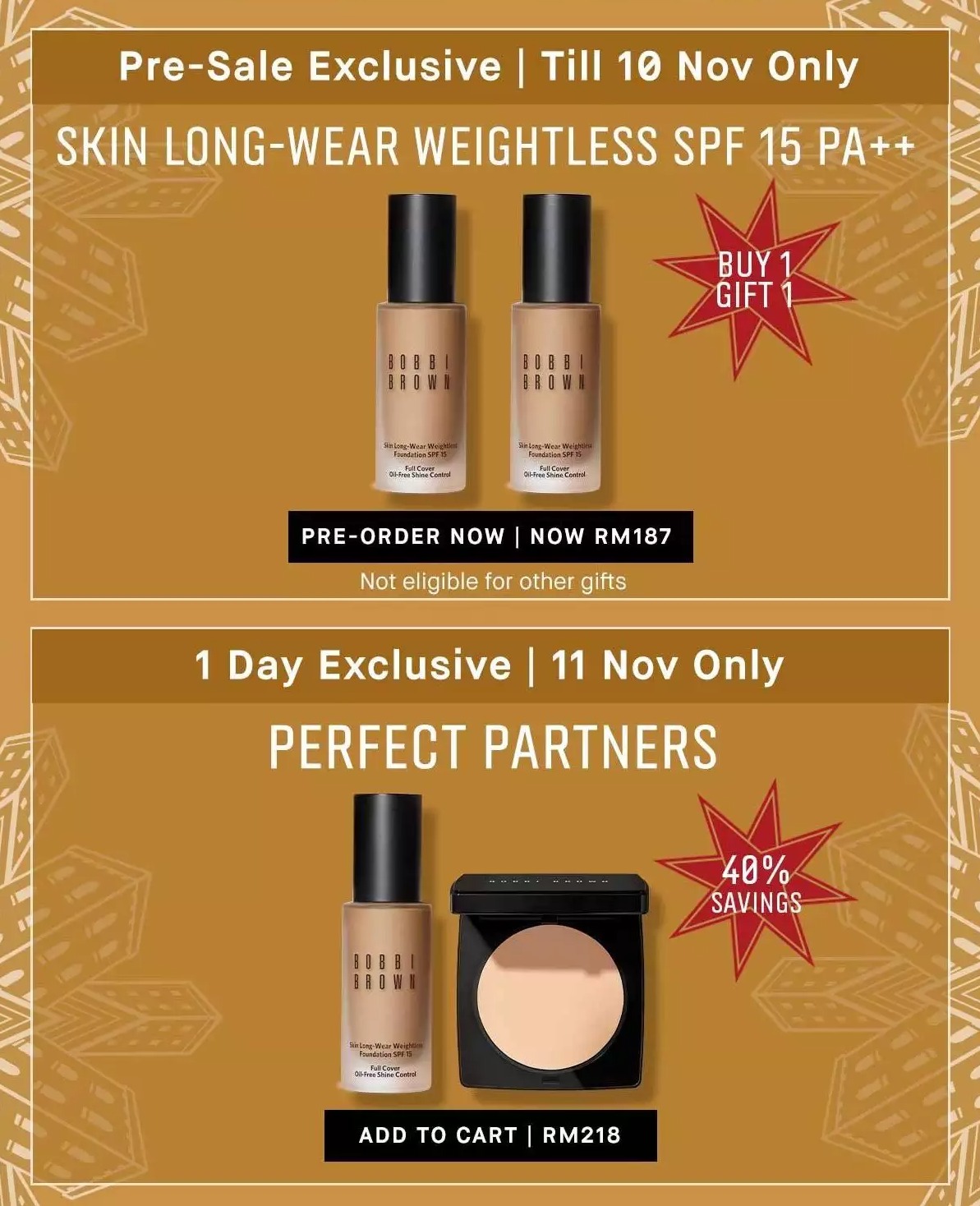 - Bobbi Brown Skin Long-Wear Weightless SPF 15PA++ (买一送一) – RM187【点击这里】