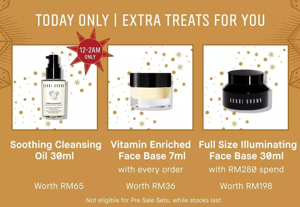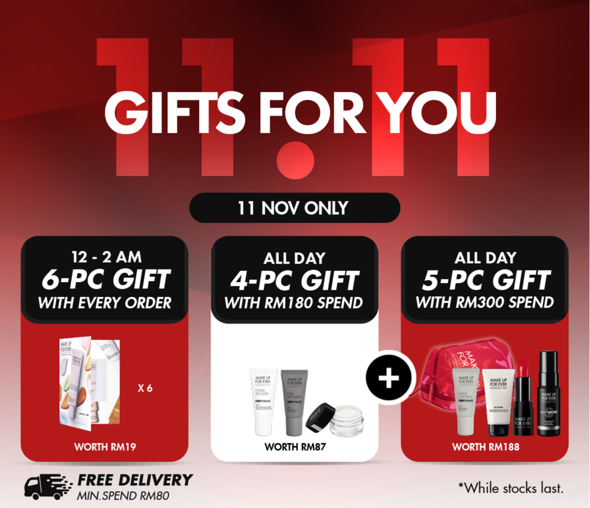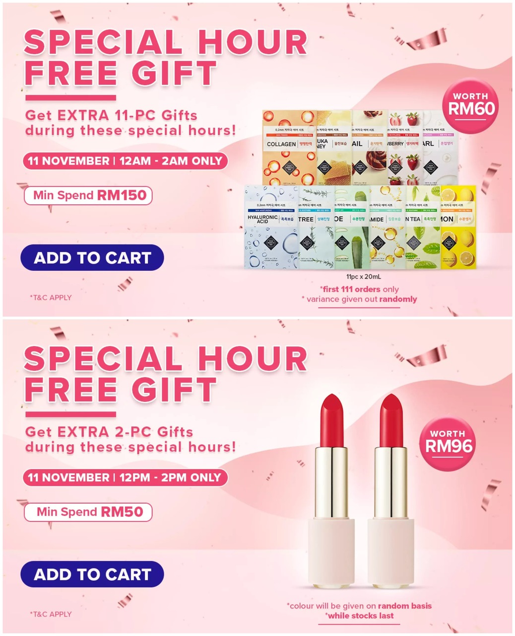 - 消费RM150 免费送出11样赠品(价值RM60;仅限12am -2am)