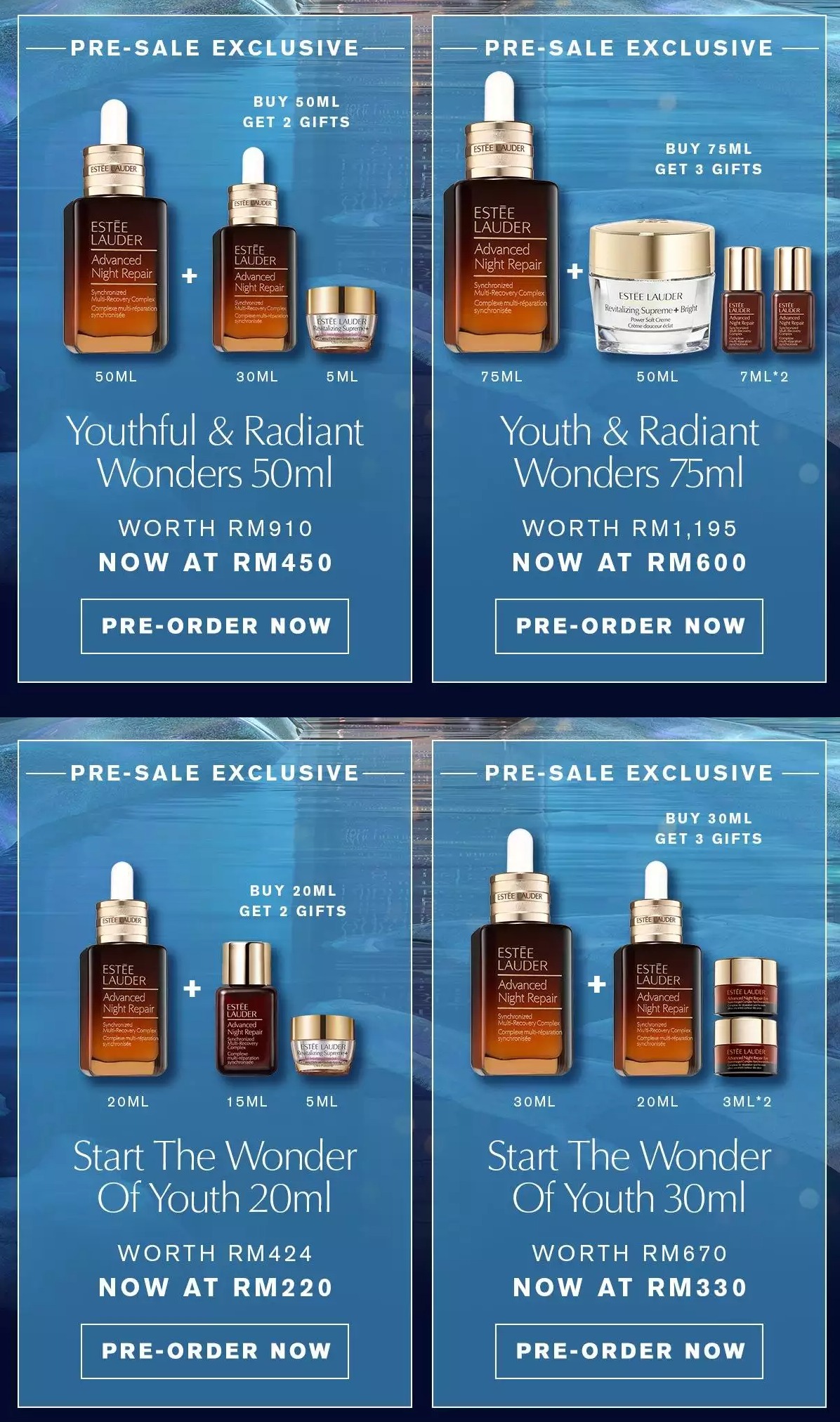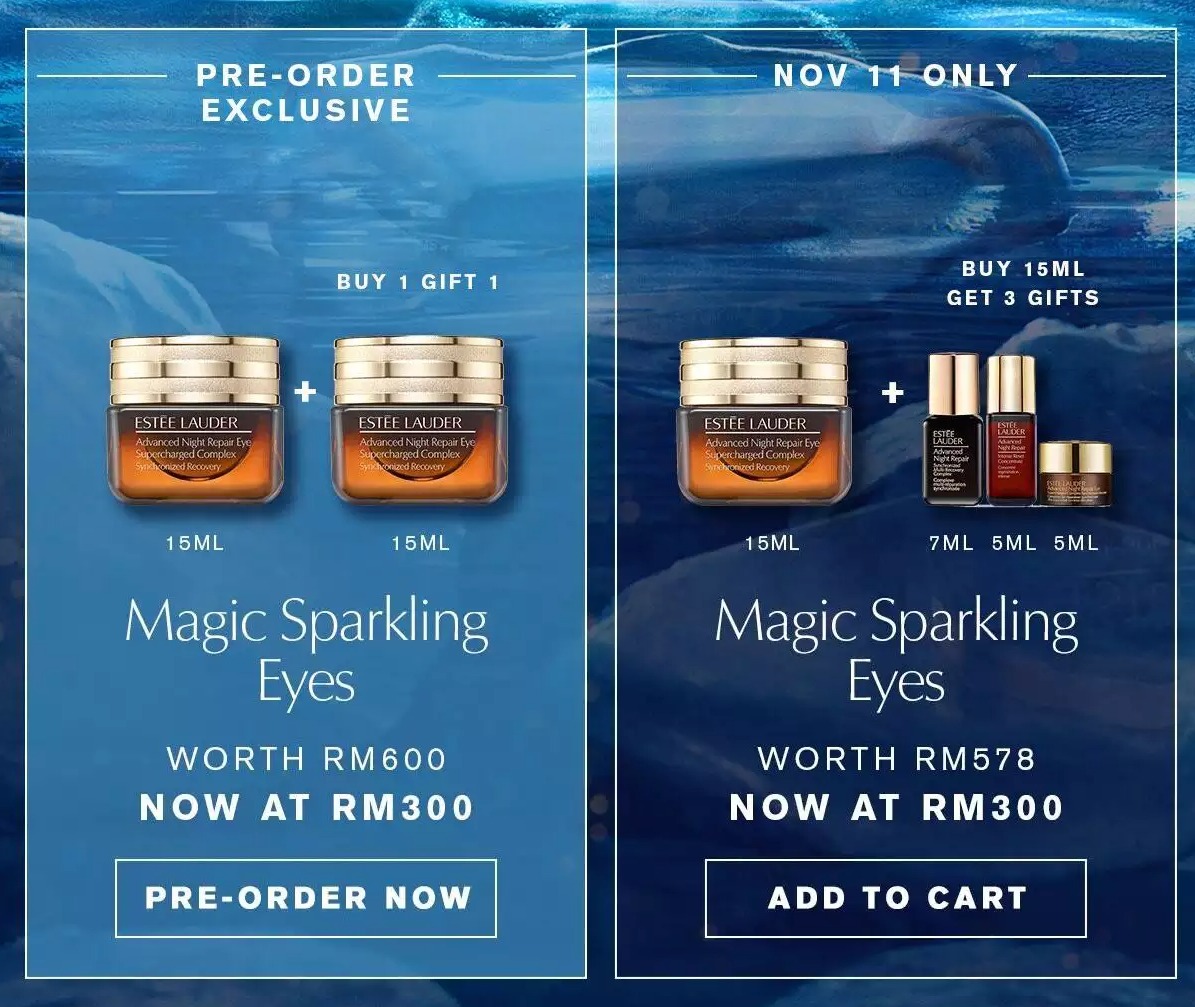 - Advanced Night Repair Eye Supercharged Complex Synchronized Recovery Eye Cream 15ml + Advanced Night Repair Synchronized Multi-Recovery Complex 7ml – RM300【点击这里】(此配套仅限11月11日)