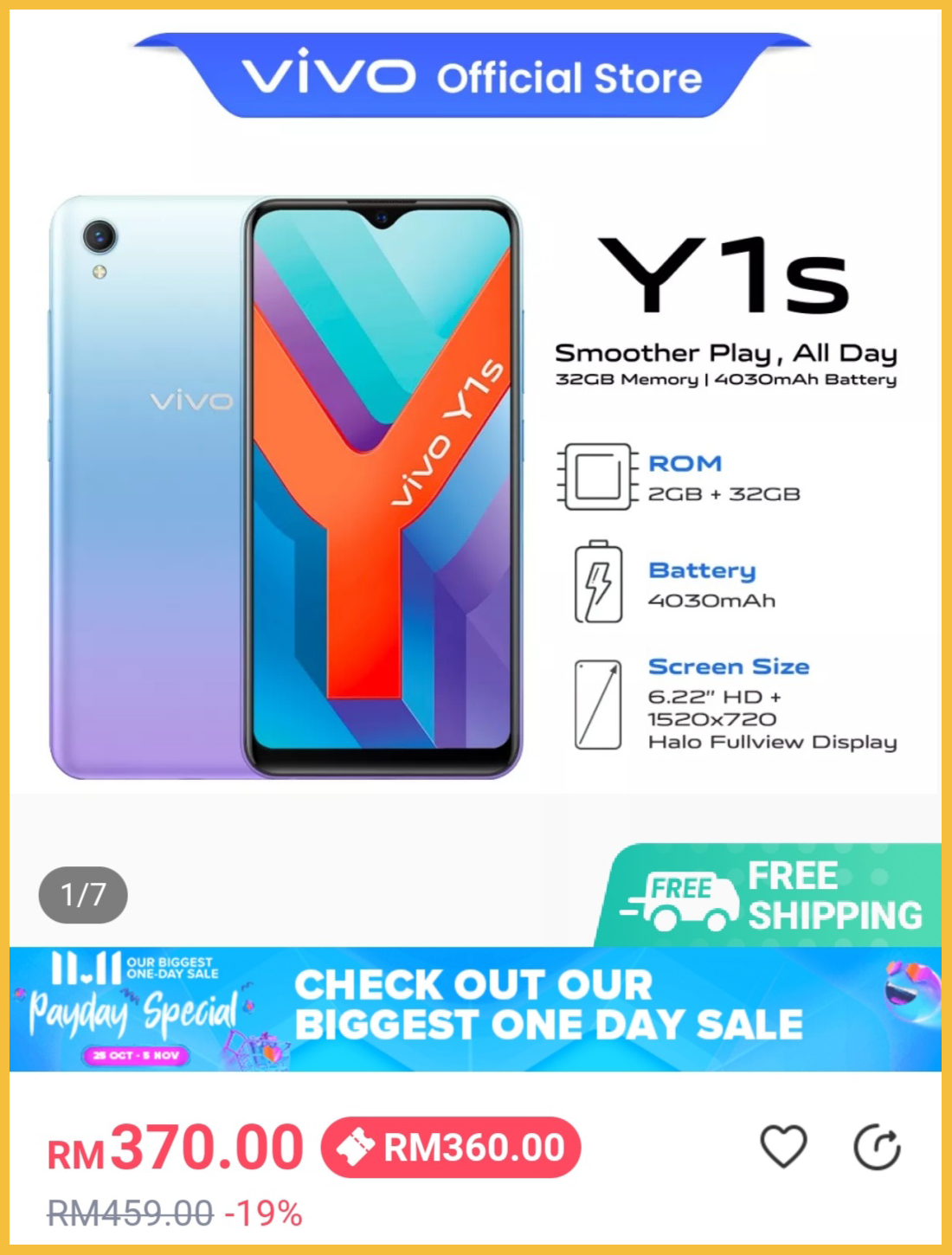 ▼ Vivo Y1s Smartphone – RM459 RM360(领取店家折扣券后的价格)