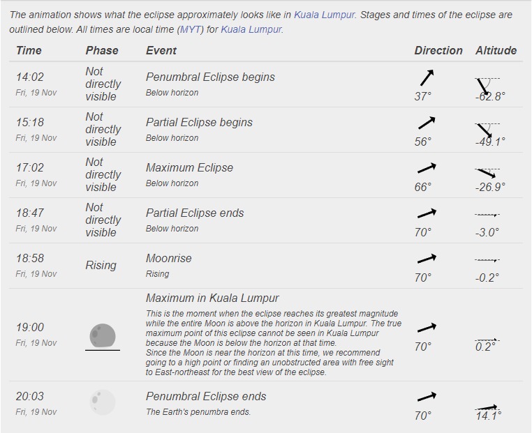 根据timeanddate 网站观测图显示,此“天狗食月”将会在大马时间6:58pm 开始至8:03pm 结束!