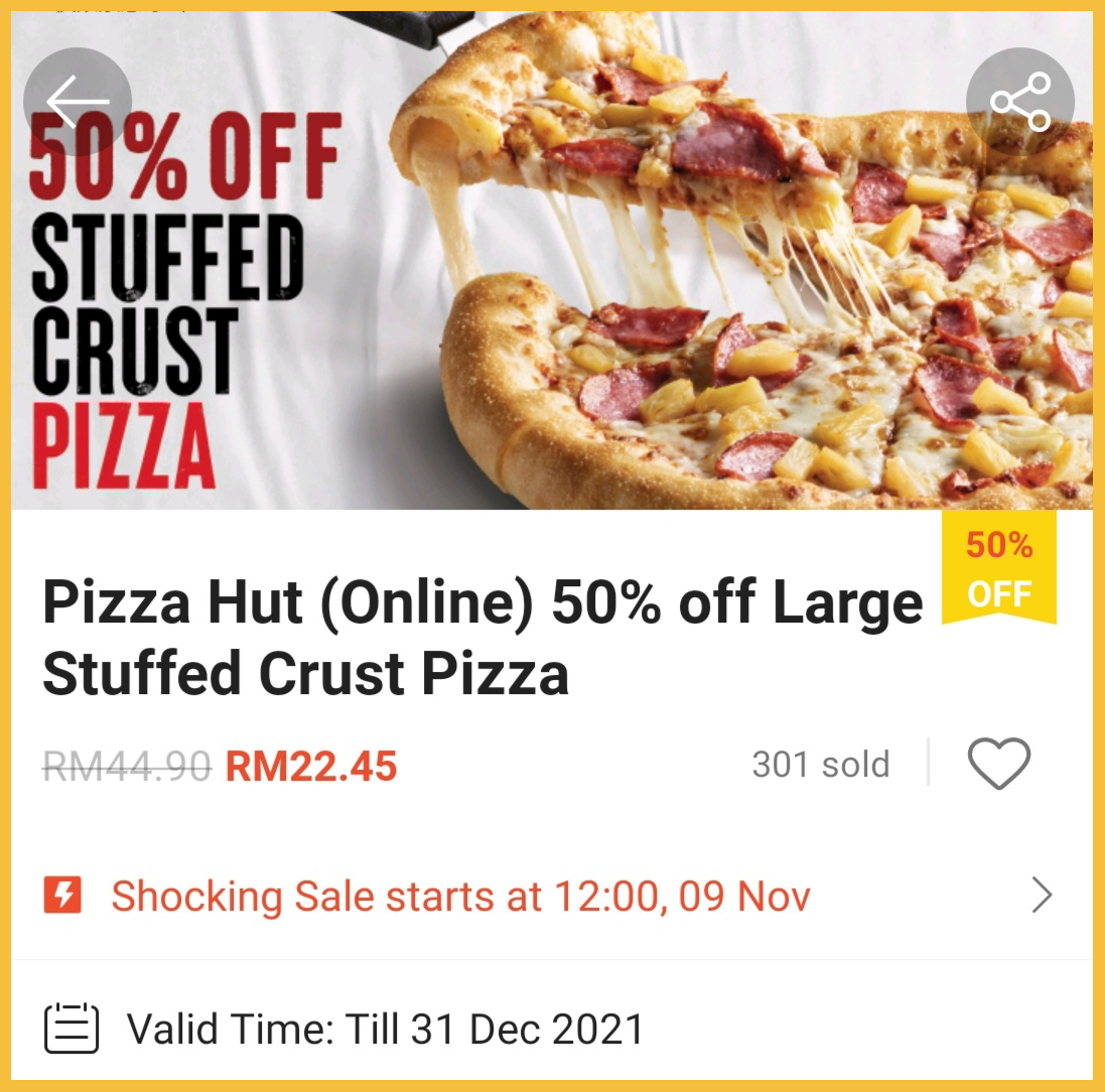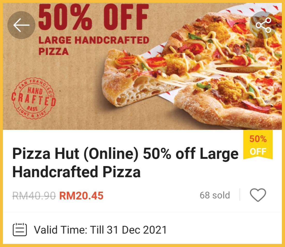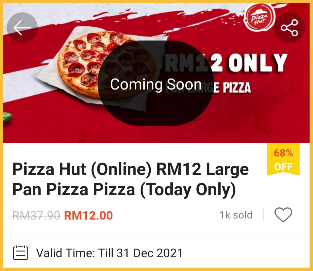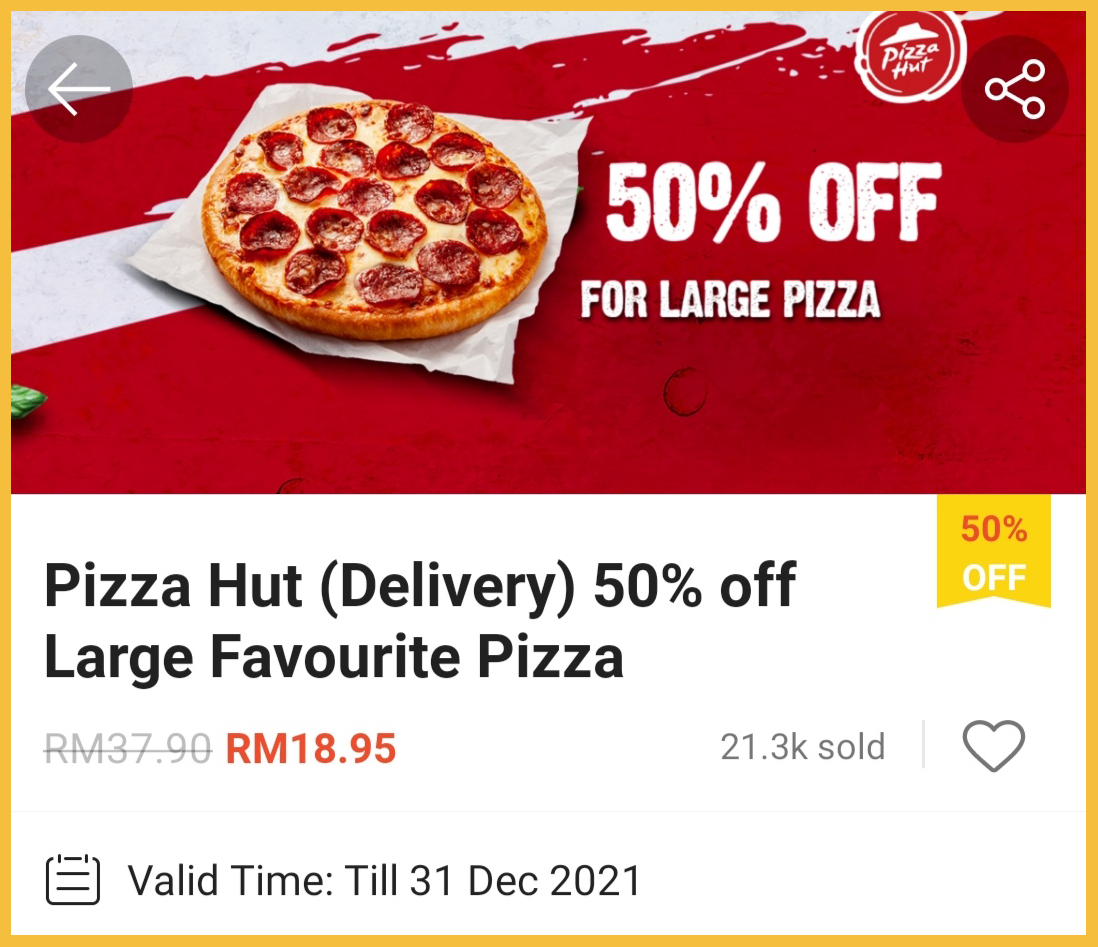 这项优惠是由Shopee 推出Pizza Hut 美食券享有50%折扣,1份Large Pizza 只需RM12!