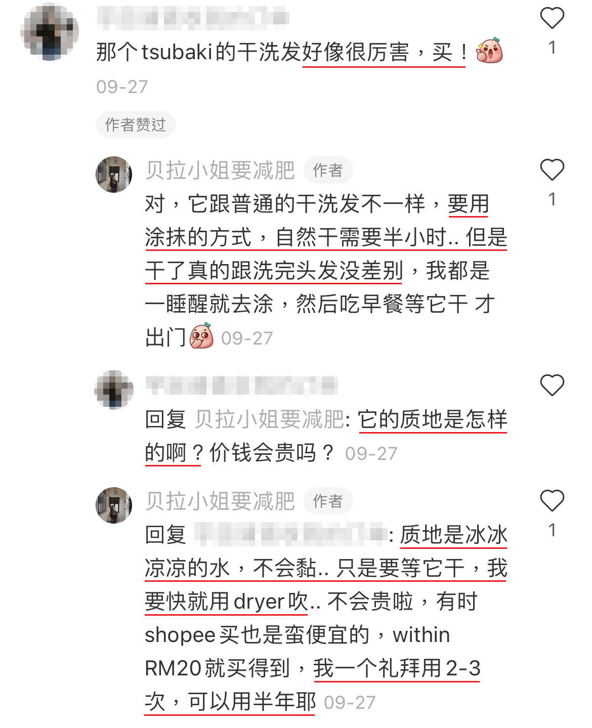 这款干洗发我彻底爱上了,只需抹一点在发根,等风干后梳顺,头发像刚刚洗完一样干爽,还有淡淡的茶树香味!我要疯狂安利这一款!