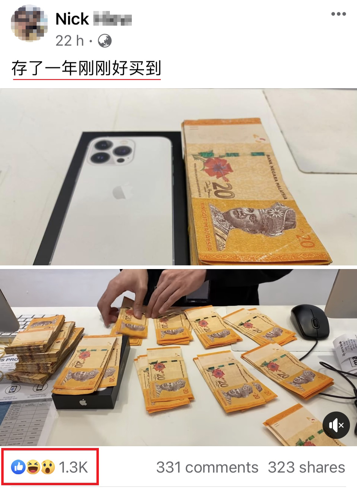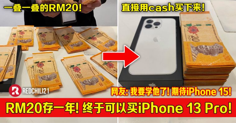▼ iPhone 13 Pro 目前的售价是从RM4,899至RM7,199,所以不难猜测,该事主这一年下来存的RM20纸钞至少有将近RM5,000!