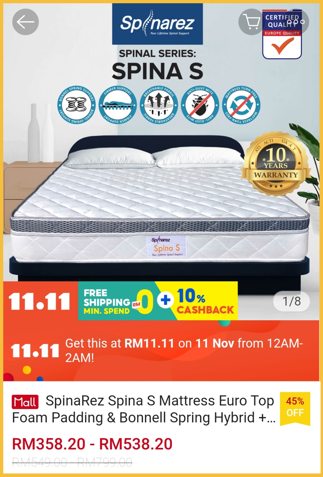 ▪ SpinaRez Spina S Tilam Mattress Euro Top Foam Padding & Bonnell Spring Hybrid + Coconut Fiber (10″) Queen – RM699 RM11.11