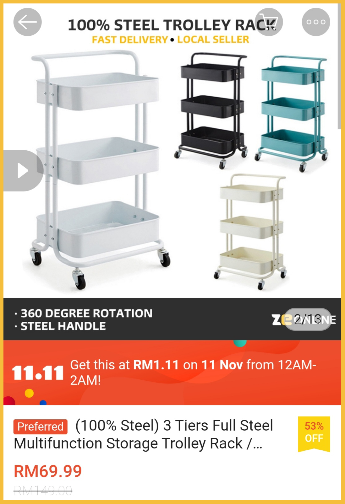 ▪3 Tiers Full Steel Multifunction Storage Trolley Rack – RM149 RM1.11