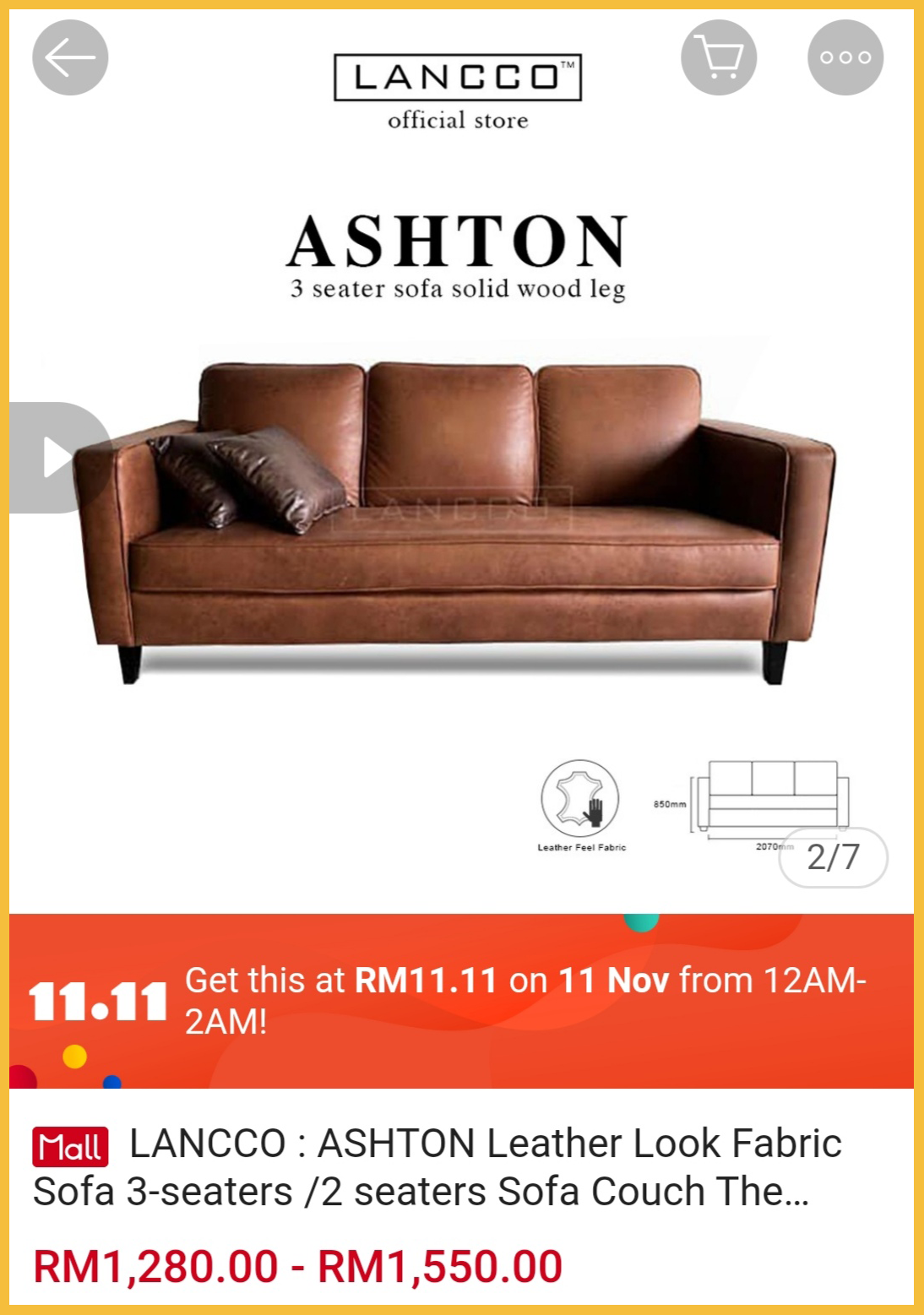 ▪ ASHTON Leather Look Fabric Sofa 3-seaters – RM1550 RM11.11