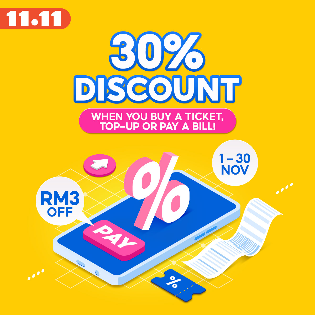 ▼ 充值手机号码、缴付账单货购买入门票享有30%折扣(高达RM3)