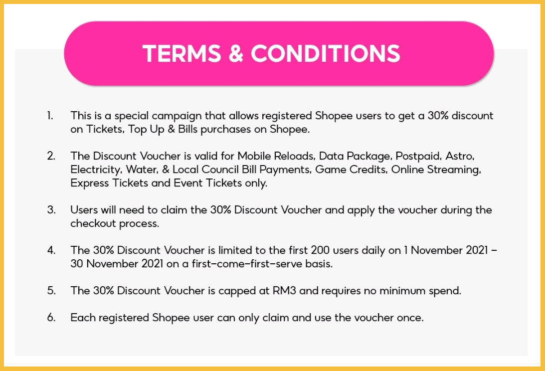 - 此优惠适合已注册Shopee 用户,才能享有30%折扣