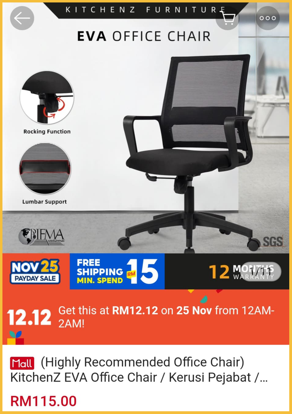 ▪KitchenZ EVA Office Chair – RM115 RM12.12