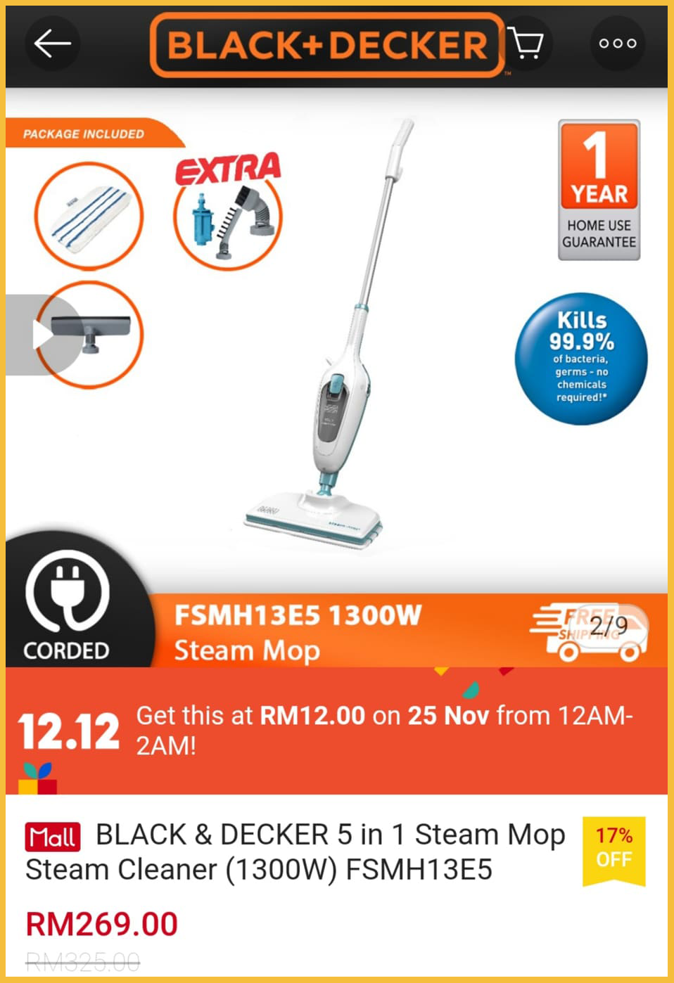 ▪ BLACK & DECKER 5 in 1 Steam Mop Steam Cleaner (1300W) – RM325 RM12